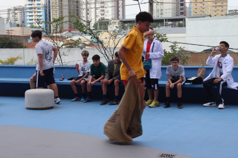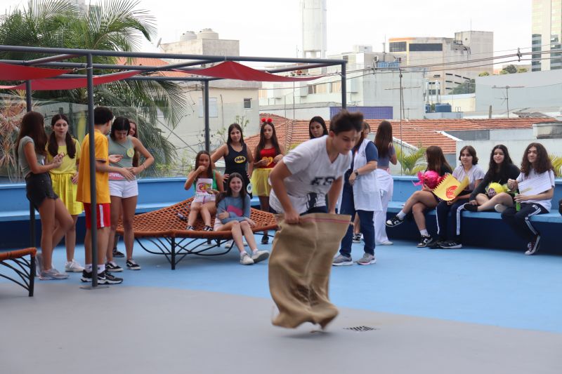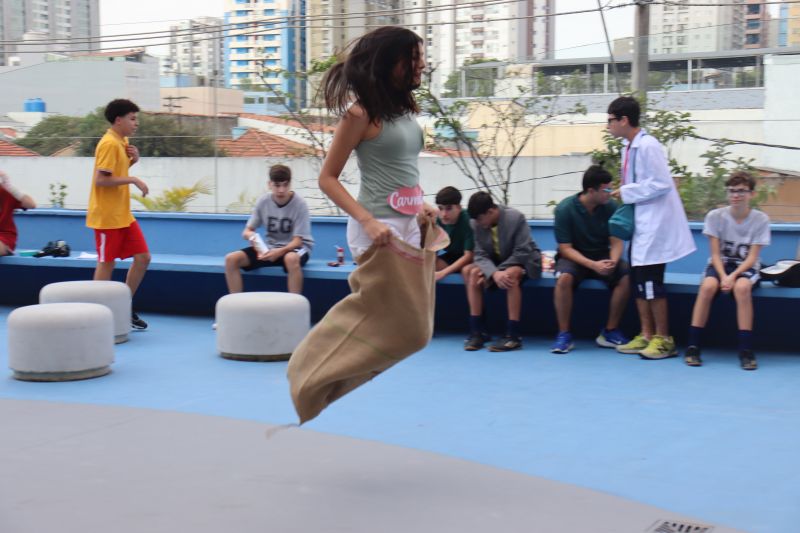 No mesmo intervalo, os alunos participaram de uma gincana - a corrida do saco. Foi um momento muito divertido para todos, em que puderam ampliar as relações sociais.