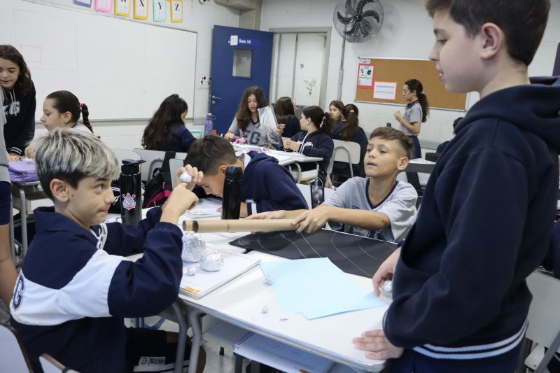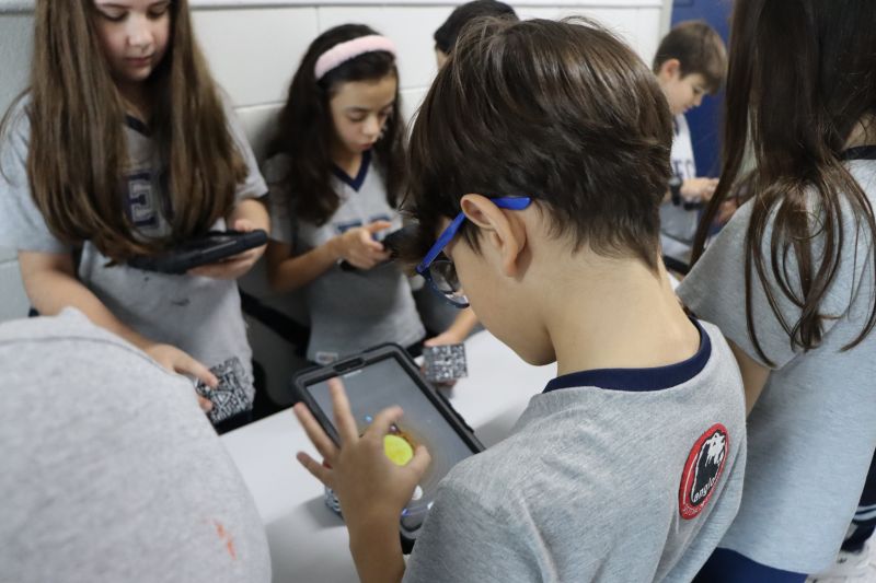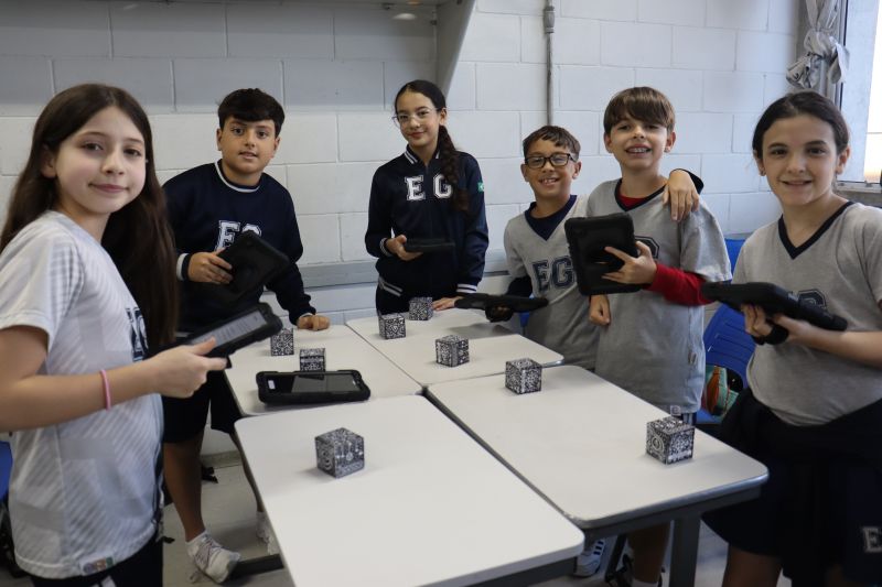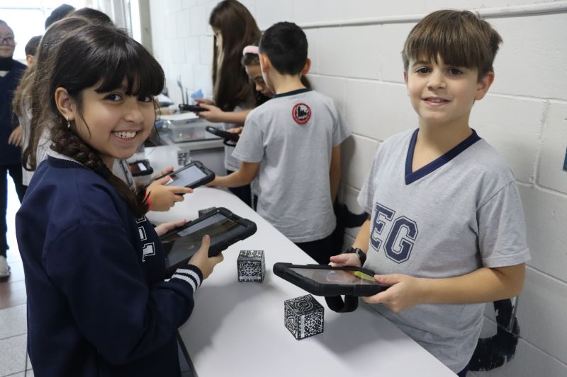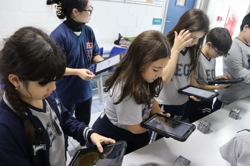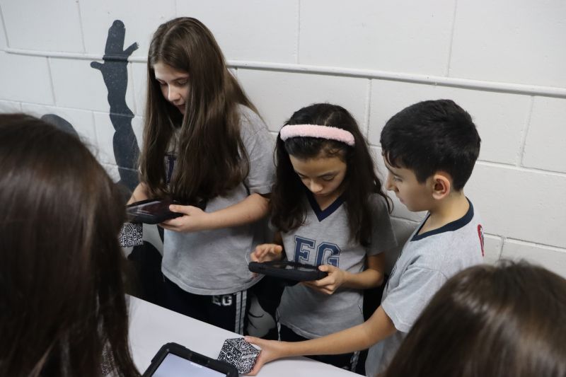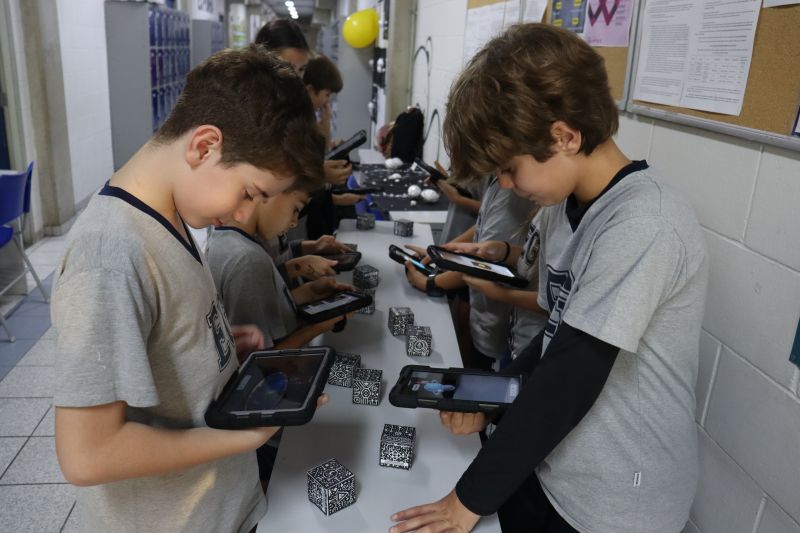Na sequência, com o auxÃlio de tablets, os alunos utilizaram recursos digitais para escanear cubos que revelavam informações e imagens sobre o Sistema Solar.