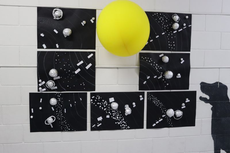 Na primeira etapa, os estudantes se organizaram em grupos e criaram representações dos planetas, utilizando esferas feitas com papel alumÃnio e respeitando uma escala proporcional que os auxiliou na visualização da diferença de tamanho entre eles. Para representar o Sol, foi utilizado um balão grande de látex.