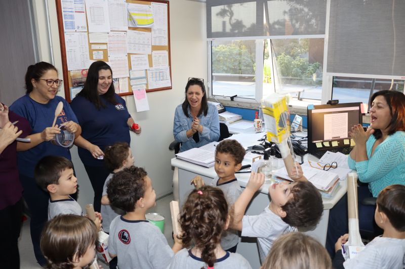 Em formato de bandinha, os pequenos desfilaram pelos corredores encantando a todos com suas confecções e seu entusiasmo.