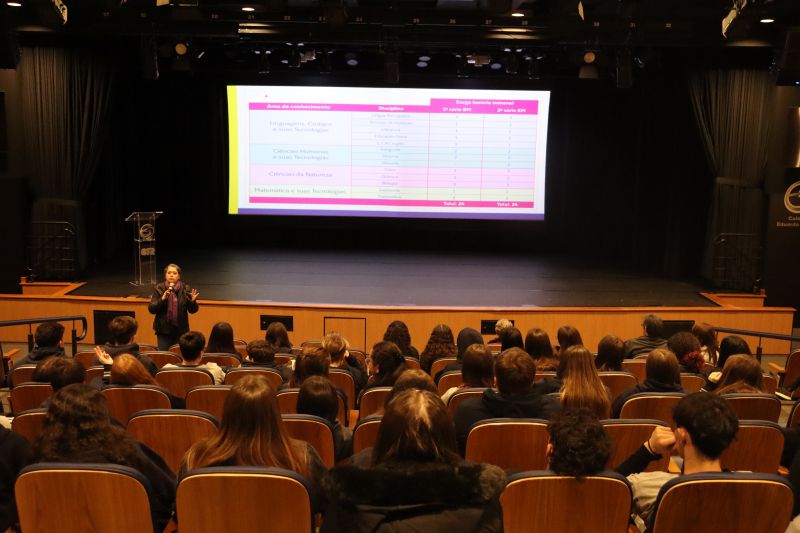 Antes das férias de julho, as Coordenadoras Pedagógicas do 6º ano do Ensino Fundamental ao Ensino Médio, Professoras Thaís e Mara, conversaram com os alunos do 9º ano do Ensino Fundamental para explicar quais serão as mudanças no Ensino Médio.