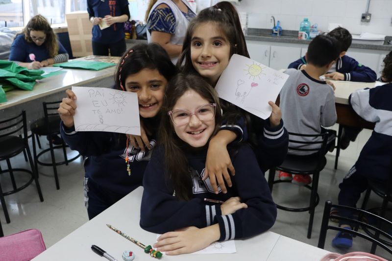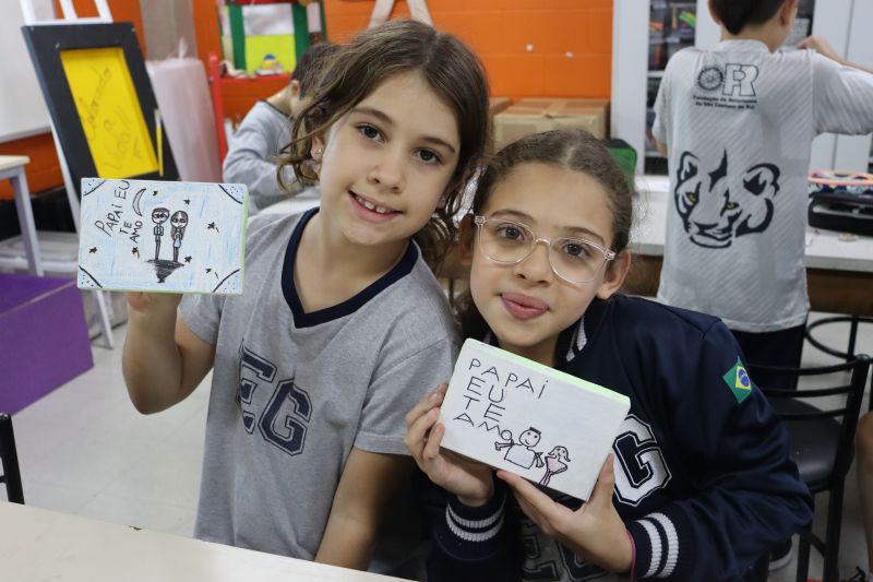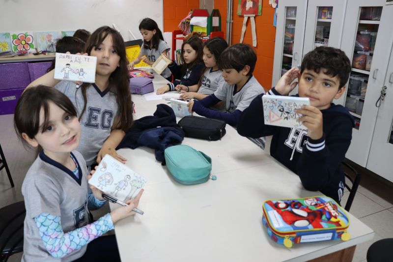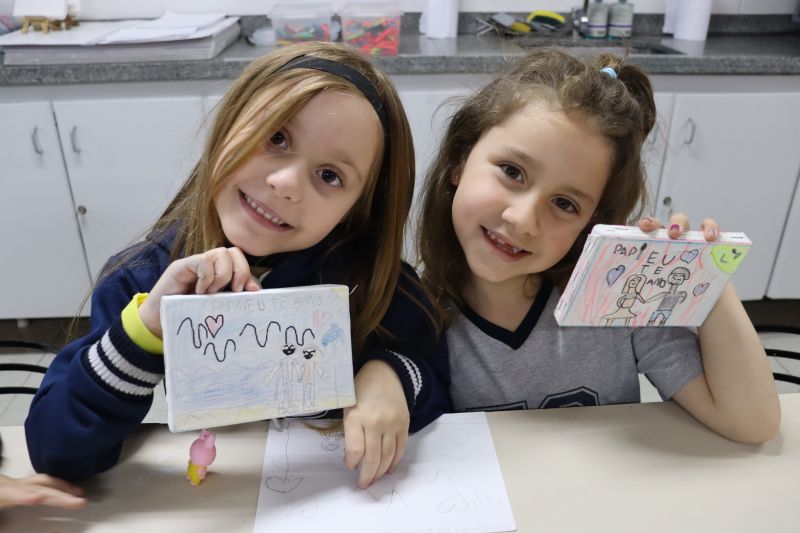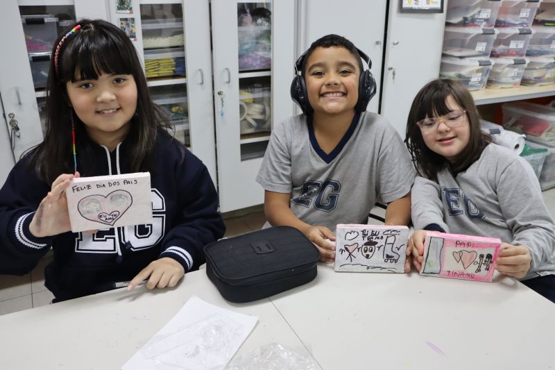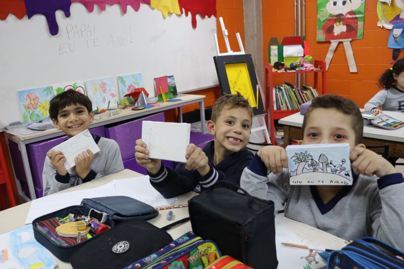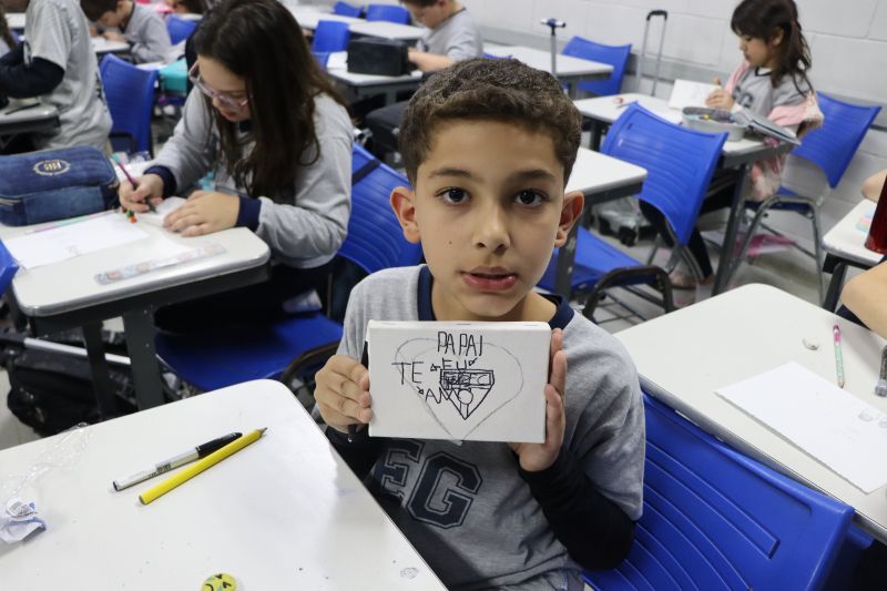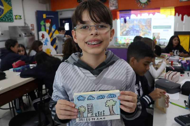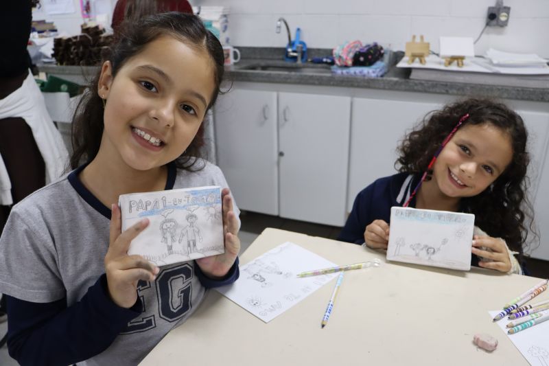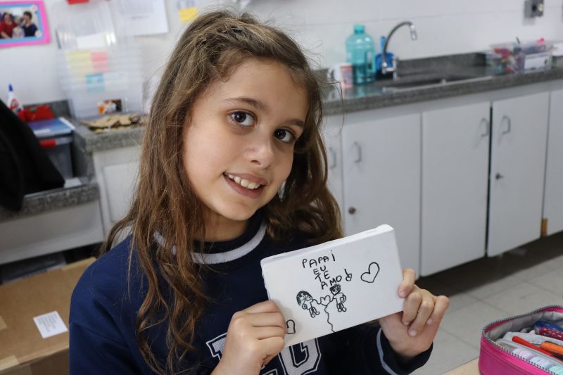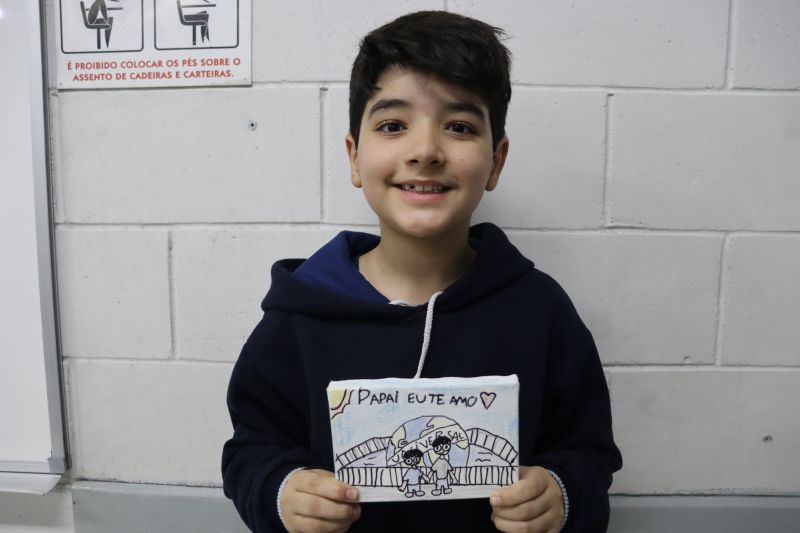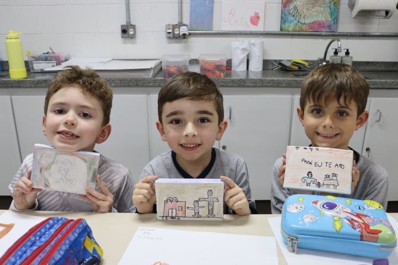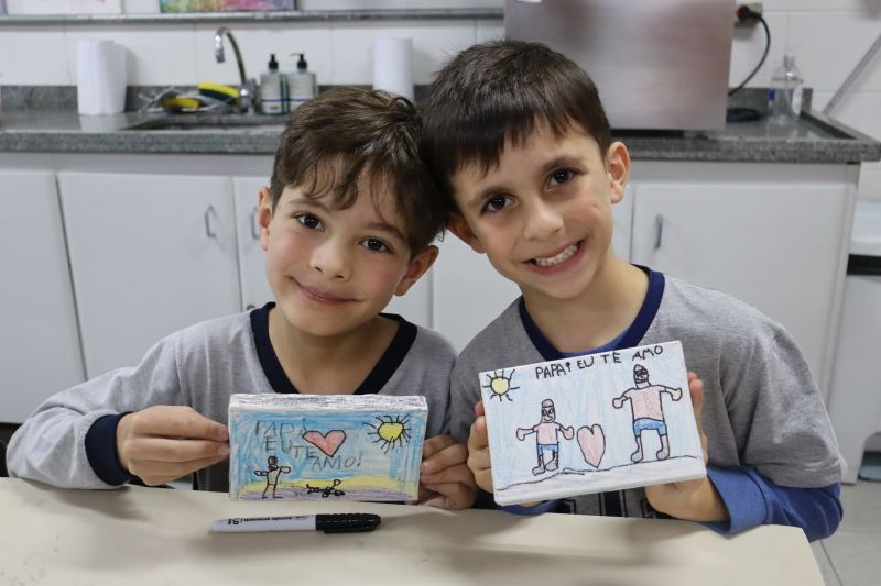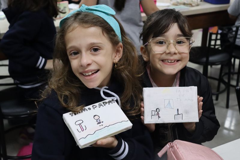 Durante as aulas de Arte, sob a orientação da Professora Vick, os estudantes pintaram telas, transmitindo o carinho e a admiração que sentem. Junto com a tela, cada estudante levou um nécessaire personalizado para seu pai.