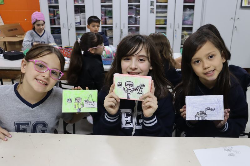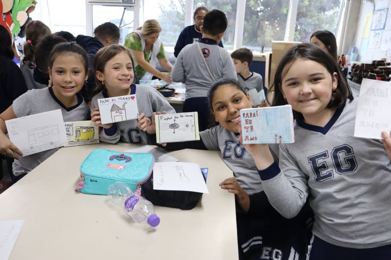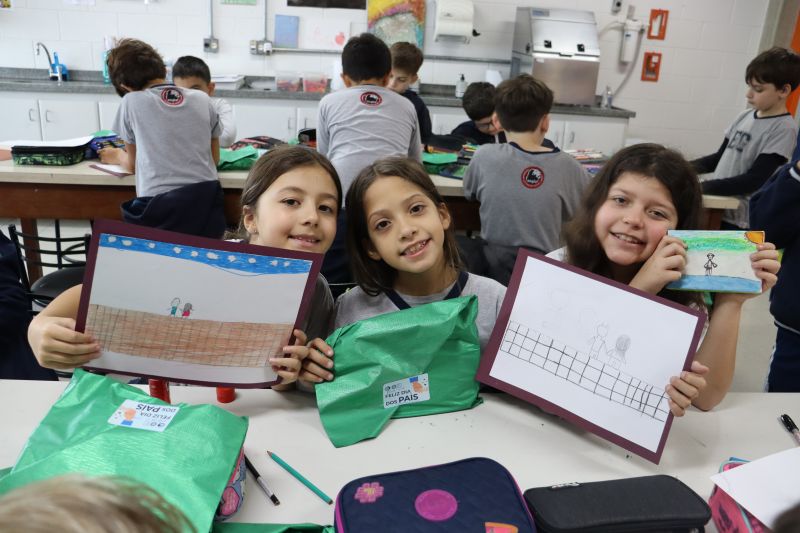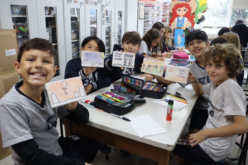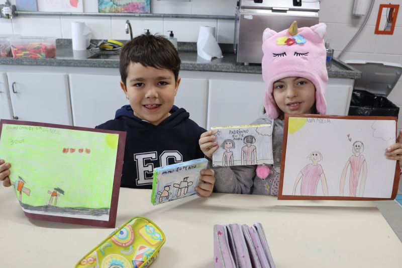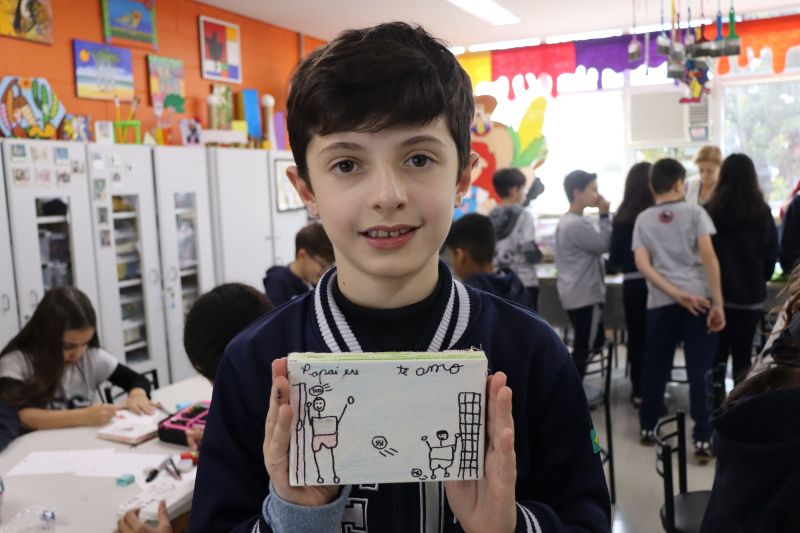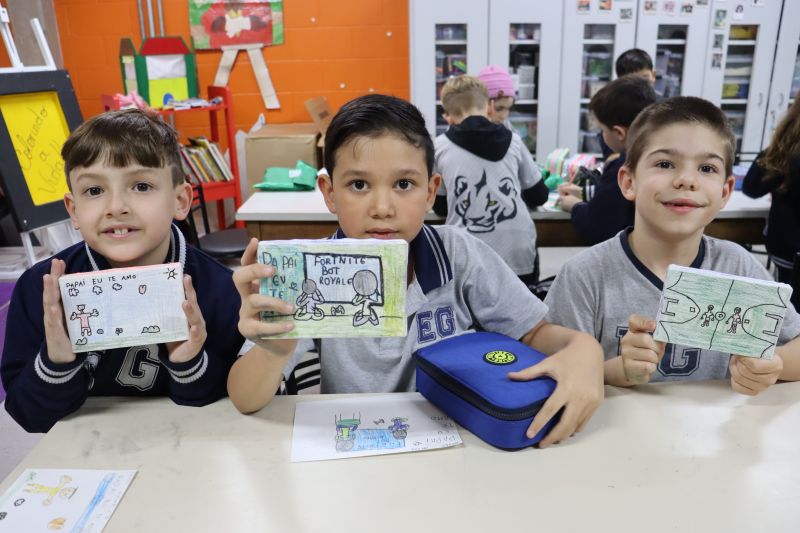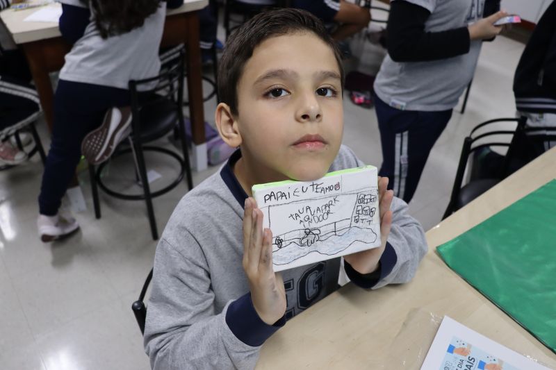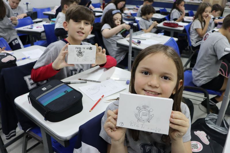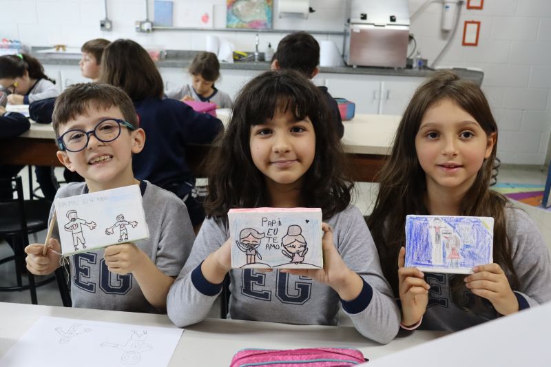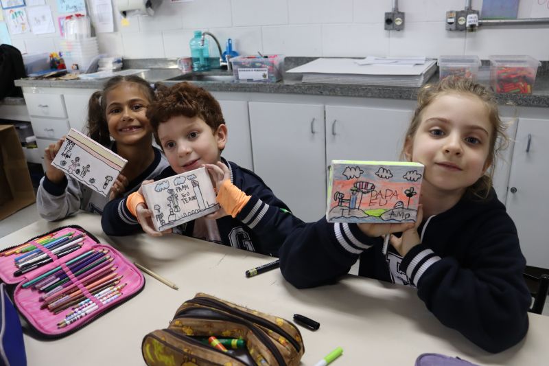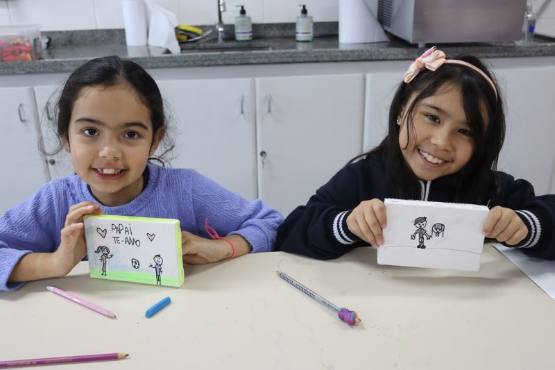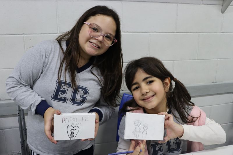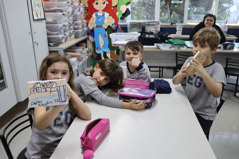 Durante as aulas de Arte, sob a orientação da Professora Vick, os estudantes pintaram telas, transmitindo o carinho e a admiração que sentem. Junto com a tela, cada estudante levou um nécessaire personalizado para seu pai.
