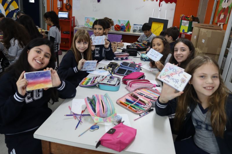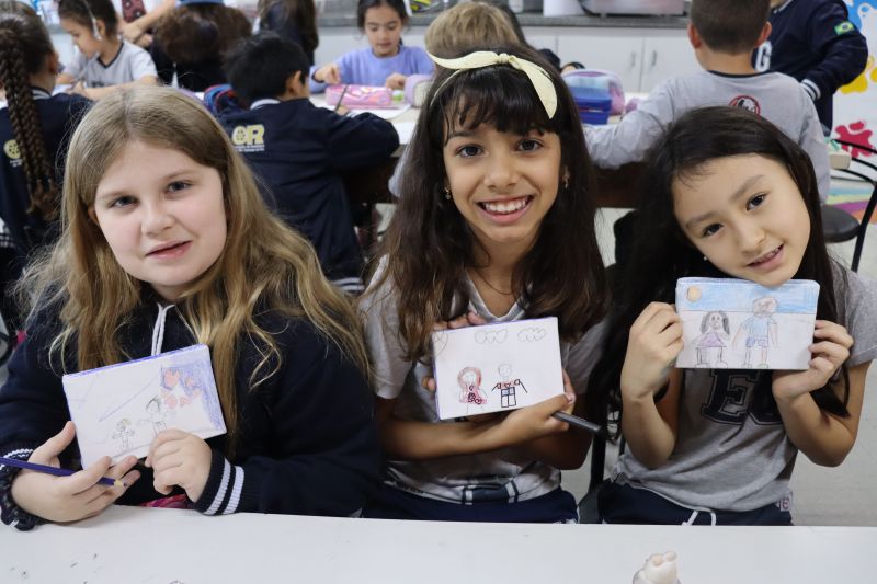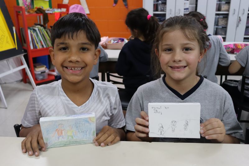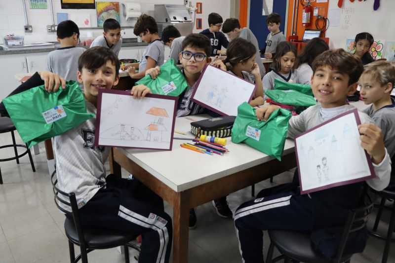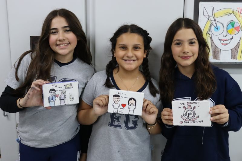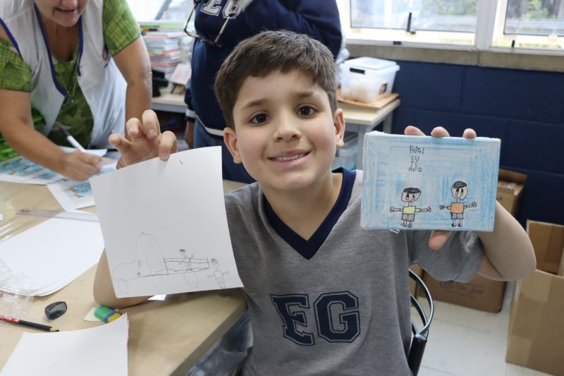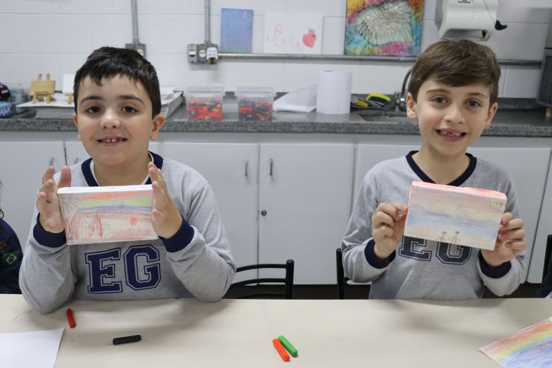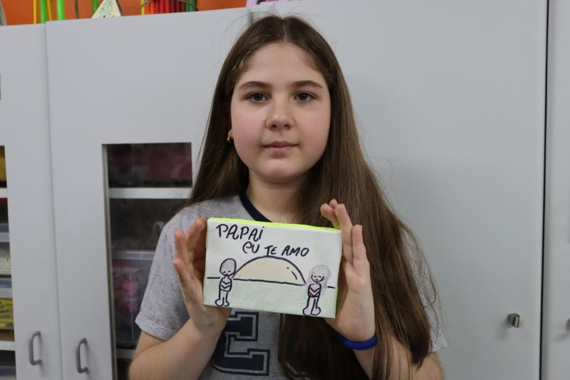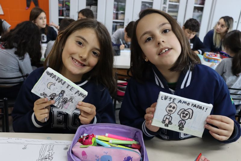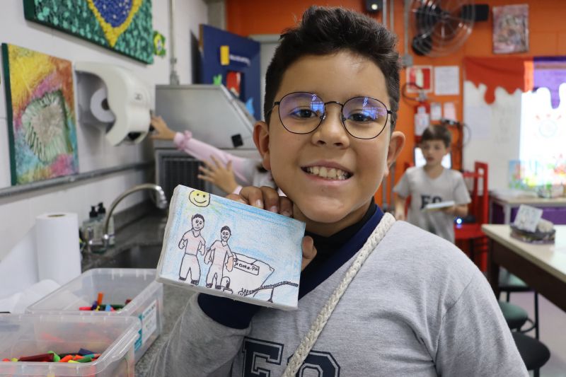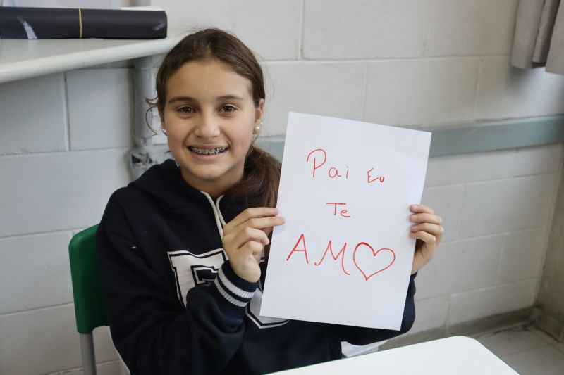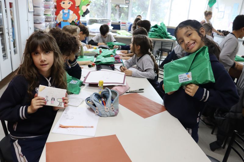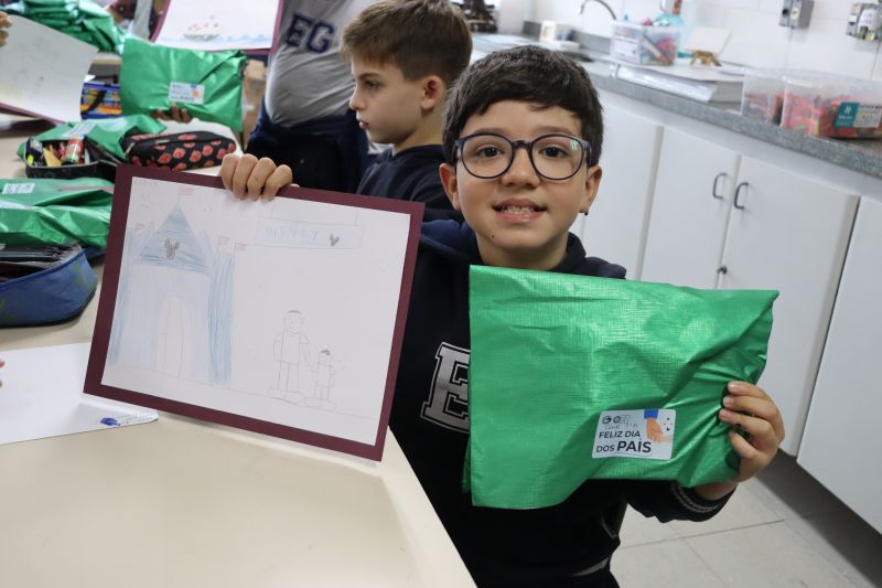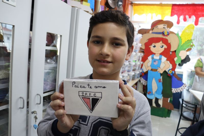 Durante as aulas de Arte, sob a orientação da Professora Vick, os estudantes pintaram telas, transmitindo o carinho e a admiração que sentem. Junto com a tela, cada estudante levou um nécessaire personalizado para seu pai.