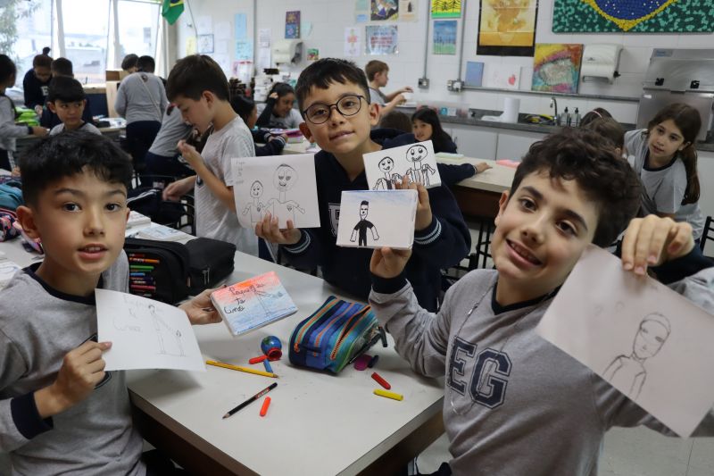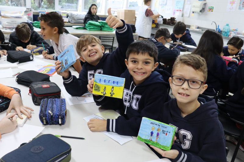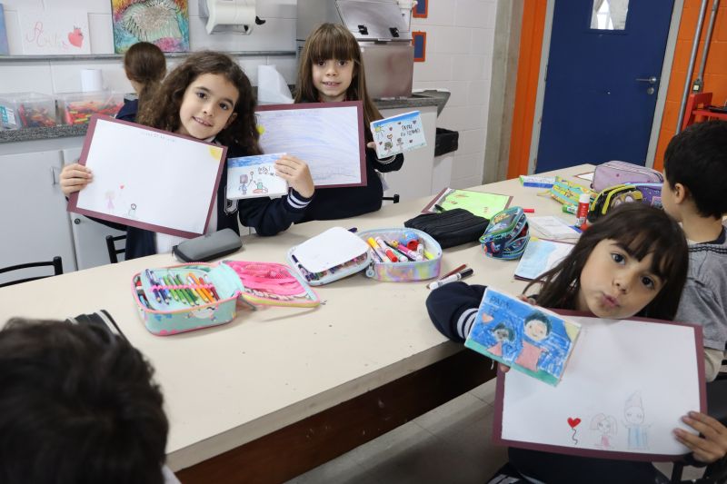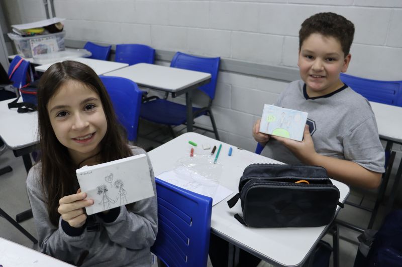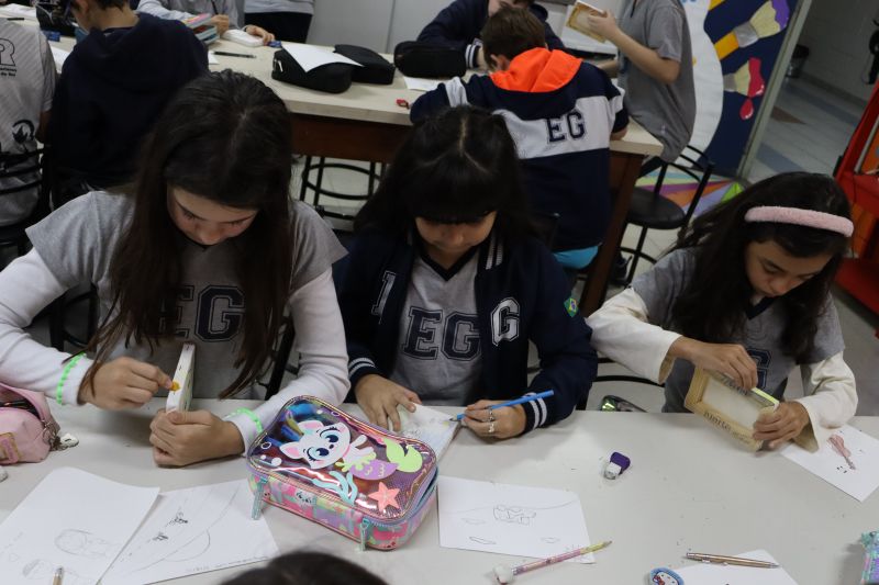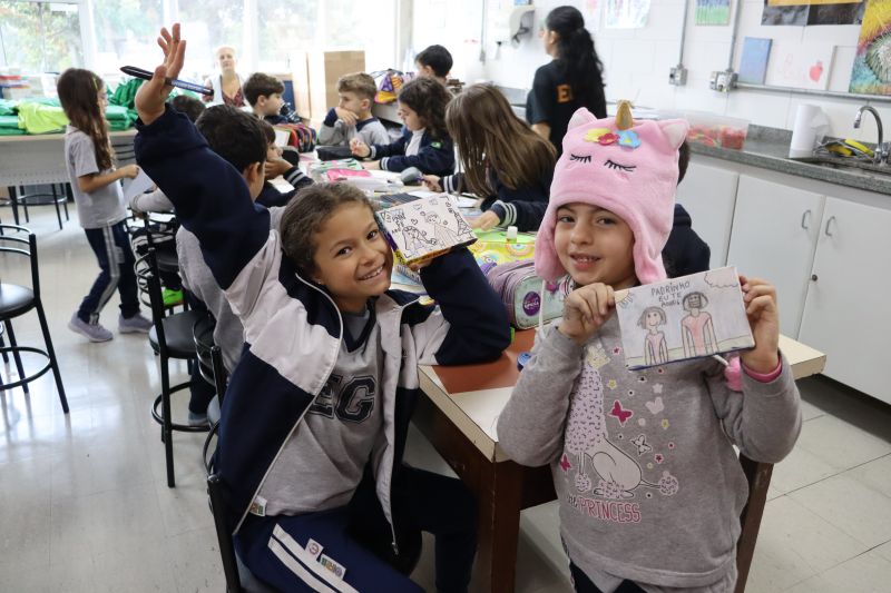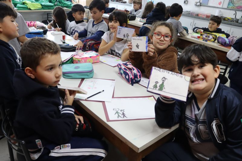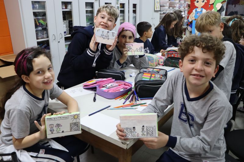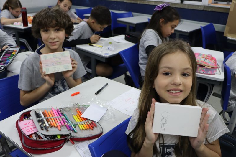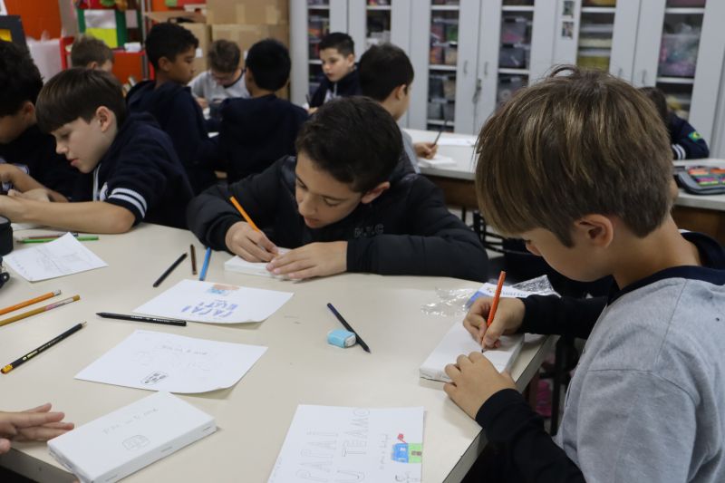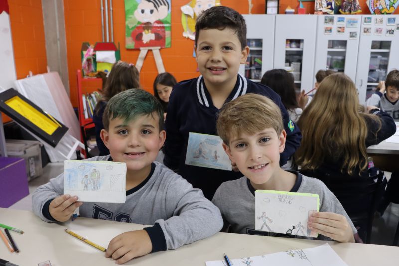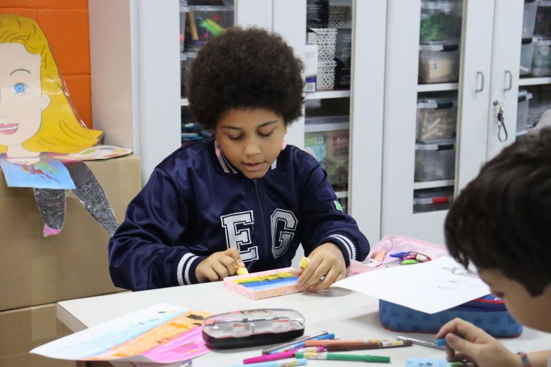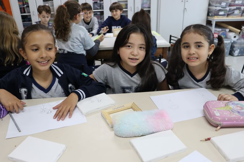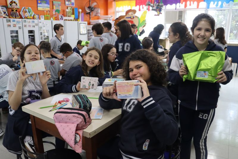 Durante as aulas de Arte, sob a orientação da Professora Vick, os estudantes pintaram telas, transmitindo o carinho e a admiração que sentem. Junto com a tela, cada estudante levou um nécessaire personalizado para seu pai.