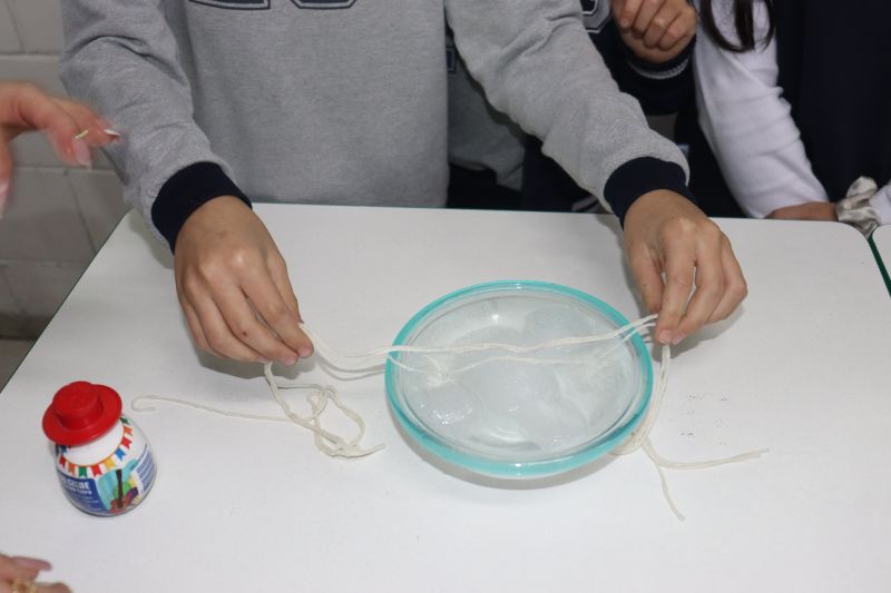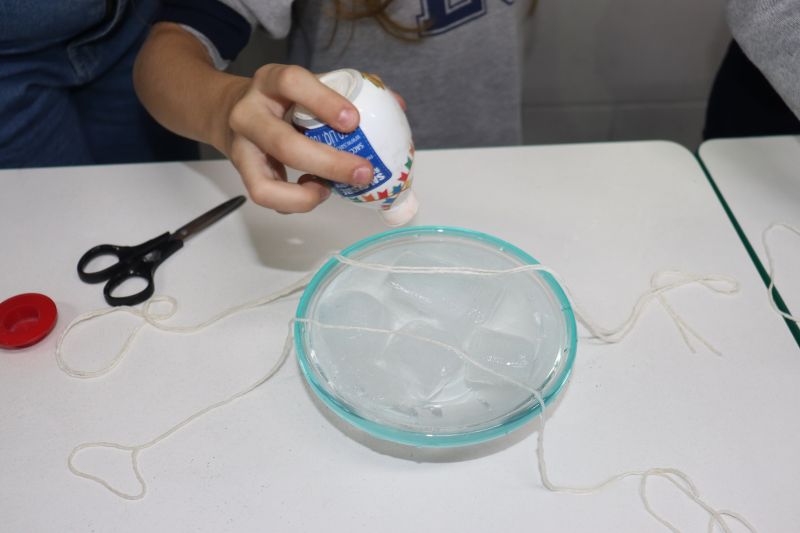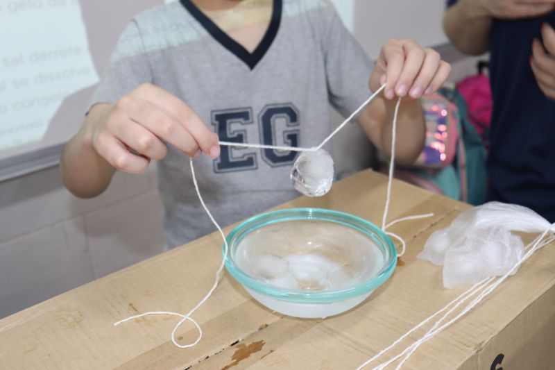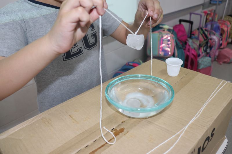 Para a realização do experimento, os estudantes utilizaram materiais simples: cubos de gelo, sal, barbante e um pote com água. O objetivo foi desafiá-los a "pescar" o gelo, usando o barbante e o sal.