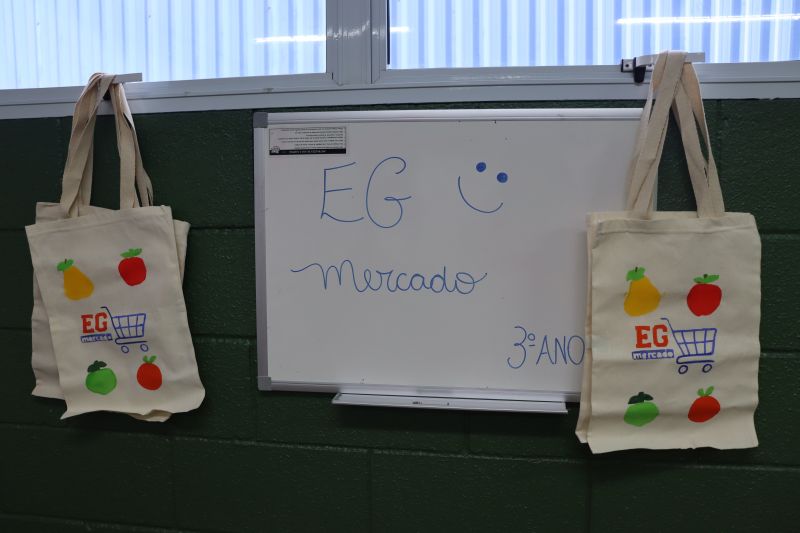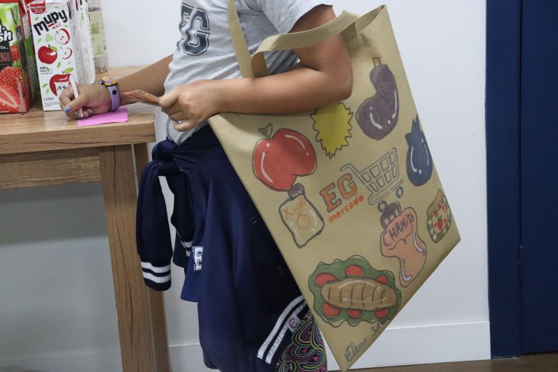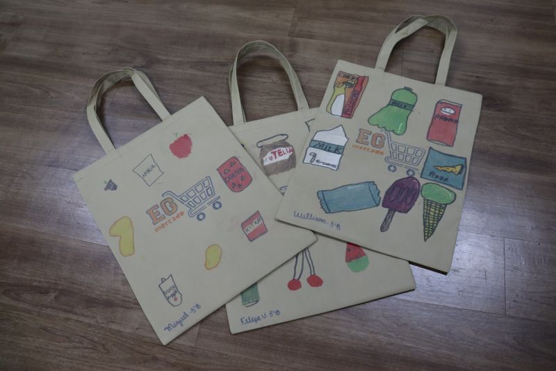 Para tornar a experiência ainda mais significativa, os alunos utilizaram sacolas retornáveis confeccionadas por eles mesmos durante as aulas de Arte, sob a orientação da Professora Vick. A produção das sacolas reforçou a importância da sustentabilidade e do consumo responsável, valores centrais do projeto.