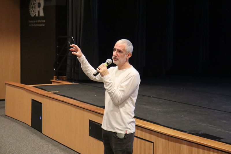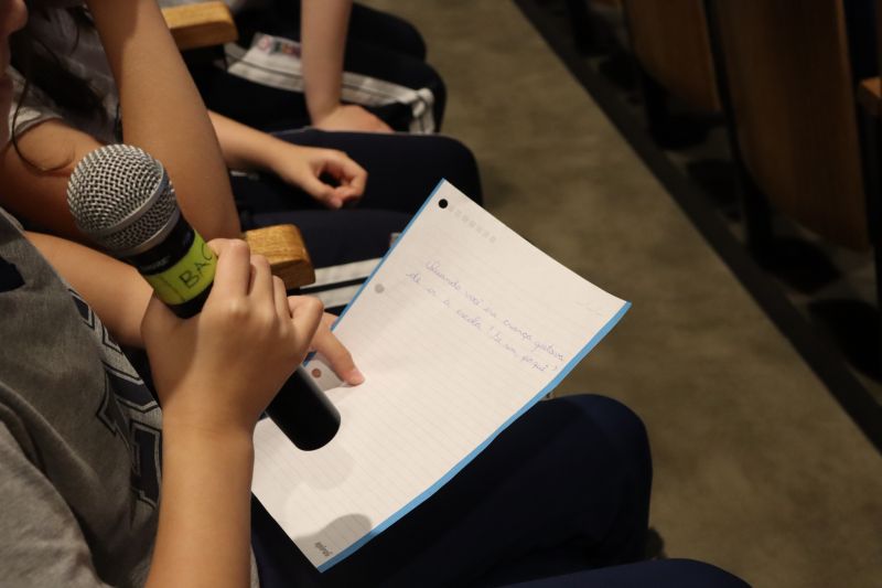 Cada aluno preparou uma pergunta por escrito e teve a oportunidade de fazê-la pessoalmente ao autor, durante o encontro realizado no Teatro Rotary.