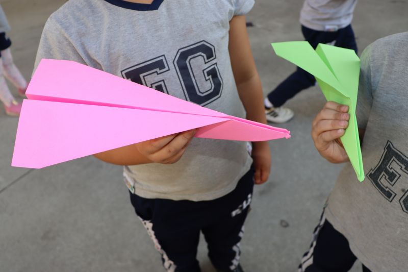 Em outro momento, os estudantes se divertiram, brincando ao ar livre com cataventos e aviõezinhos de papel, observando como o vento influencia seus movimentos.