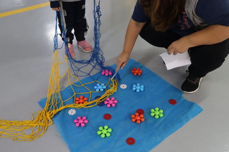 Logo em seguida, a turma se dividiu em dois grupos. Utilizando uma rede, os grupos participaram de uma “pescaria” simulada, na qual o foco foi o raciocínio lógico e a contagem, pois o desafio era contar os diferentes tipos de “peixes” capturados pelas equipes.