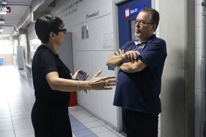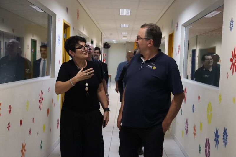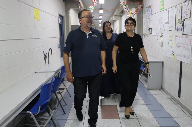 Depois, acompanhado pela Diretora e por membros do Rotary, o Governador percorreu diversos espaços do Colégio — salas de aula, laboratórios, quadras, área da piscina e outros ambientes — observando a rotina escolar e conversando com alguns estudantes.