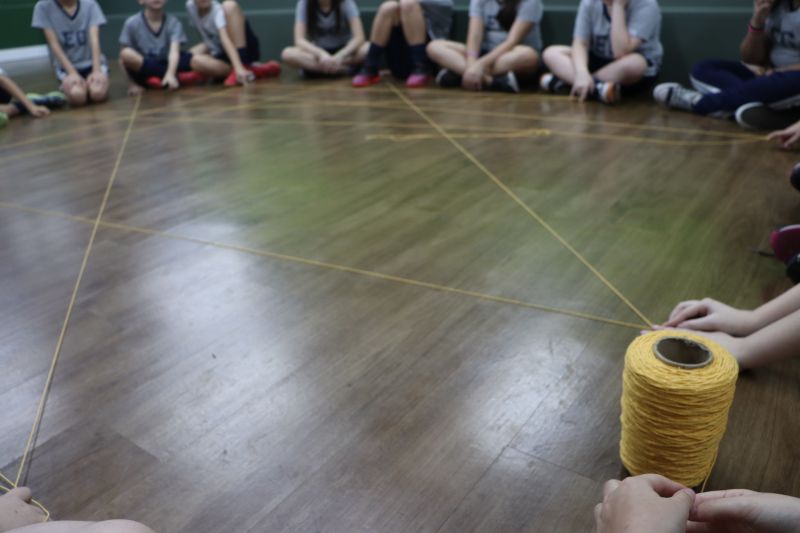 Em roda, cada aluno falava sobre o que valoriza na amizade e, após sua fala, jogava o rolo de barbante para o próximo aluno. Depois de todos manifestarem seus sentimentos, uma teia de barbante foi formada, mostrando a importância de cada um para a construção da teia.