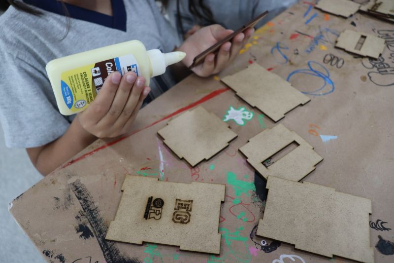 Durante a atividade, os alunos confeccionaram um cofre de madeira. Primeiro, fizeram o projeto em uma folha de sulfite, utilizando uma régua para marcar as medidas. Após a idealização do projeto, o cofre foi cortado em MDF, e cada aluno montou o seu.