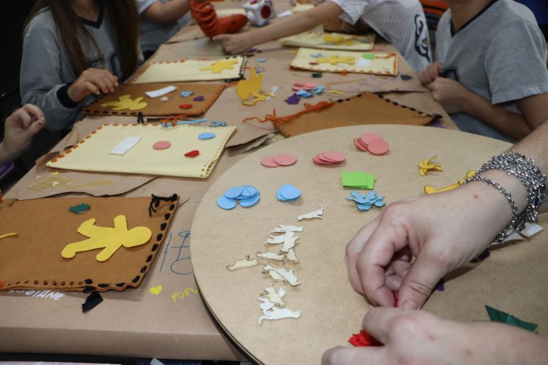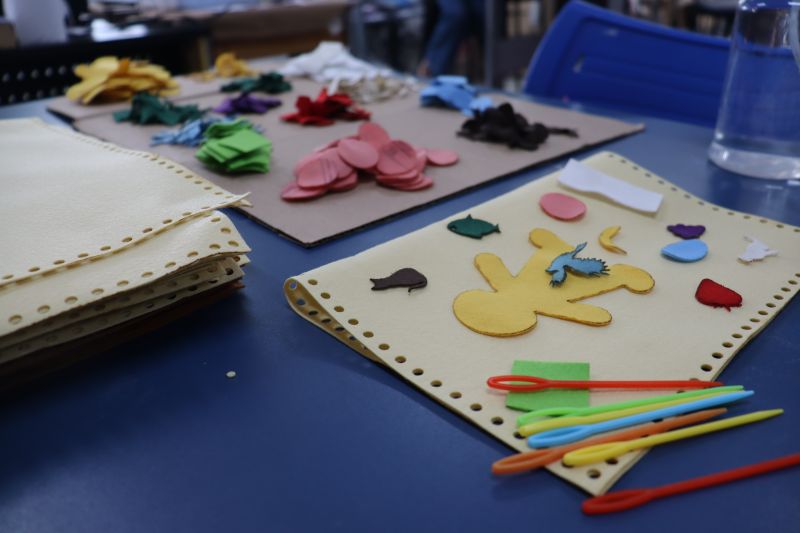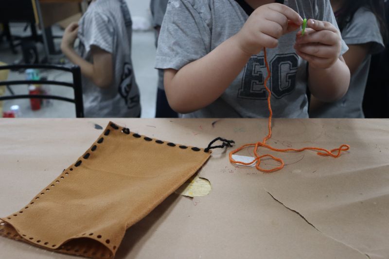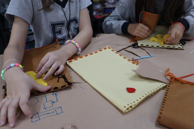 No primeiro momento, as crianças demonstraram grande concentração ao costurar seus próprios saquinhos de feltro, utilizando lã para juntar as laterais. Após a costura, cada aluno recebeu pequenas peças de feltro, preparadas para representar os objetos de conhecimento aprendidos ao longo do semestre. A aula focou no desenvolvimento da coordenação motora e na revisão do conteúdo estudado em sala.