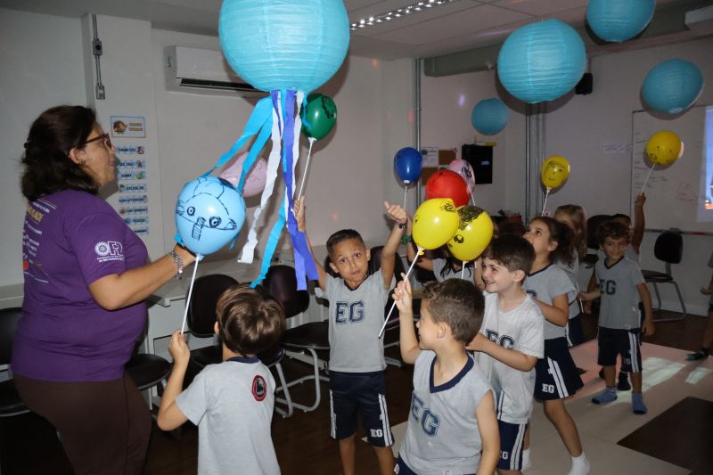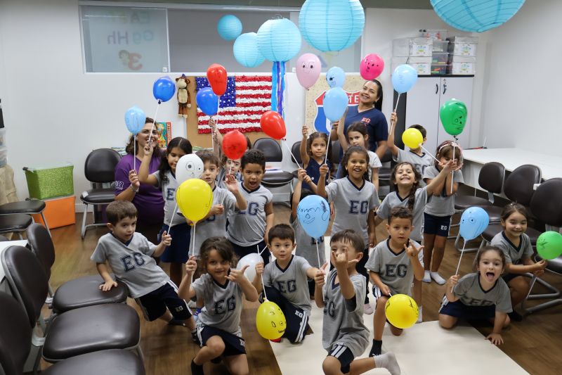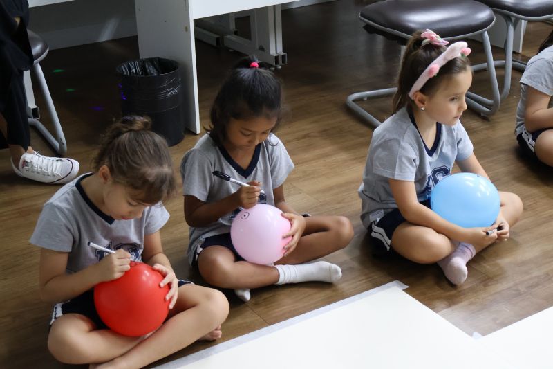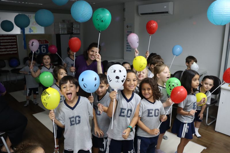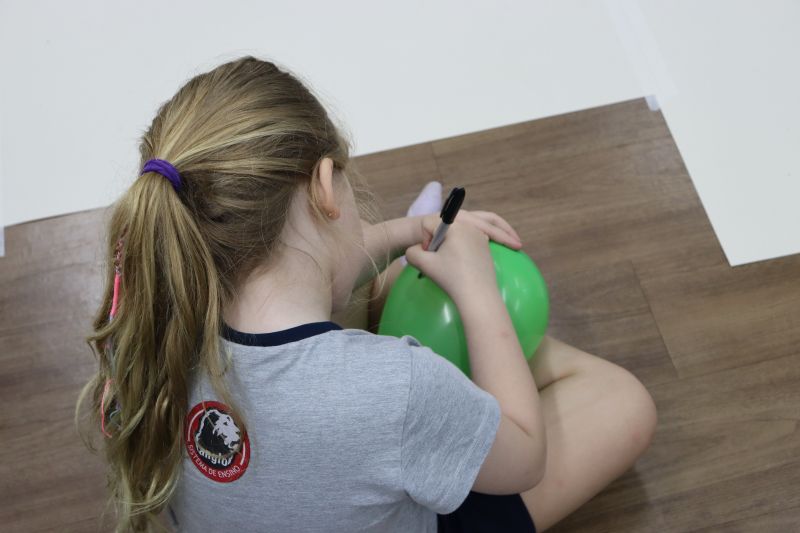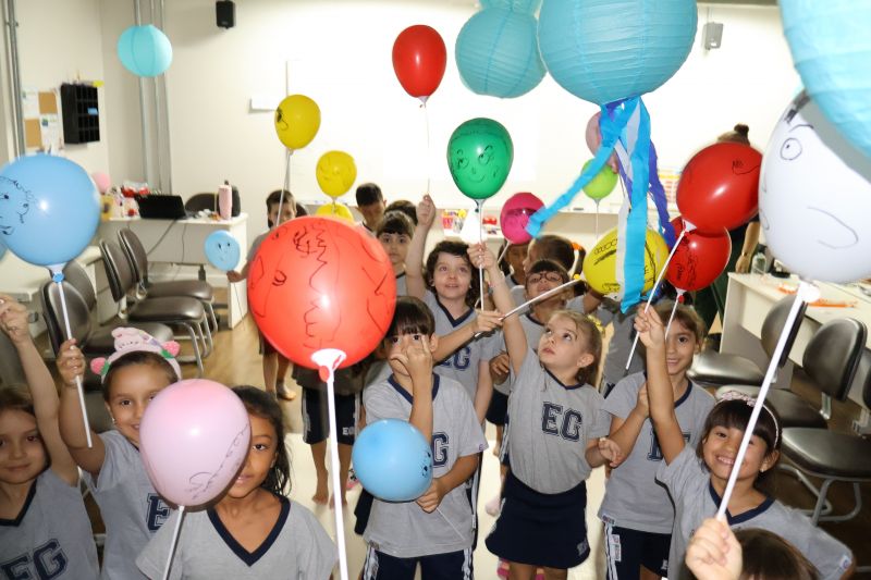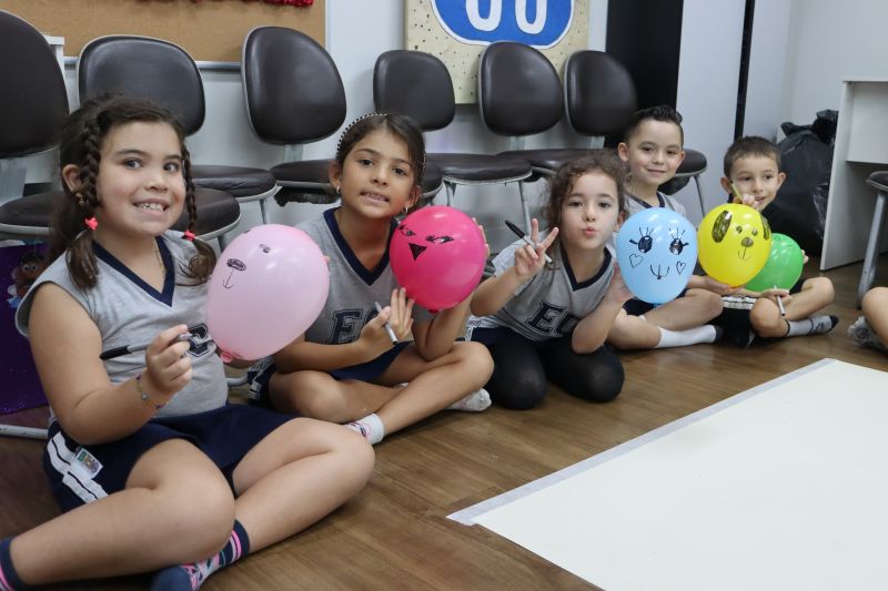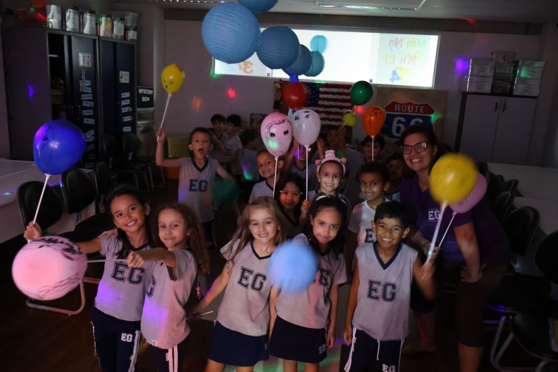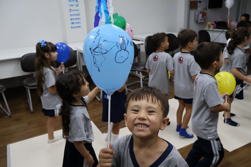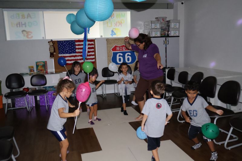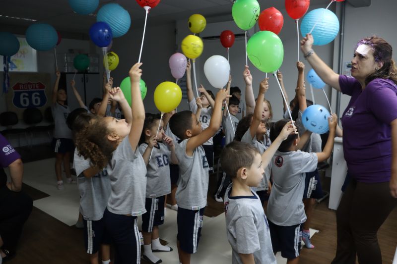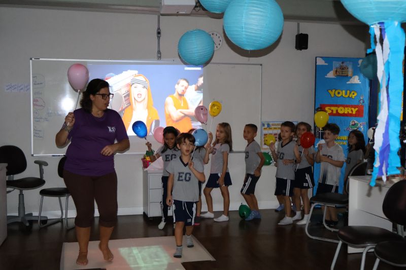 Os estudantes praticaram a linguagem oral, em inglês, com músicas e vivências coletivas. Para finalizar essa dinâmica, com o objetivo de intensificar os conhecimentos previamente obtidos em aula, a professora organizou um desfile, o Balloon Parade, no qual as crianças soltaram a criatividade, decorando seus balões e se divertindo por meio da dança.