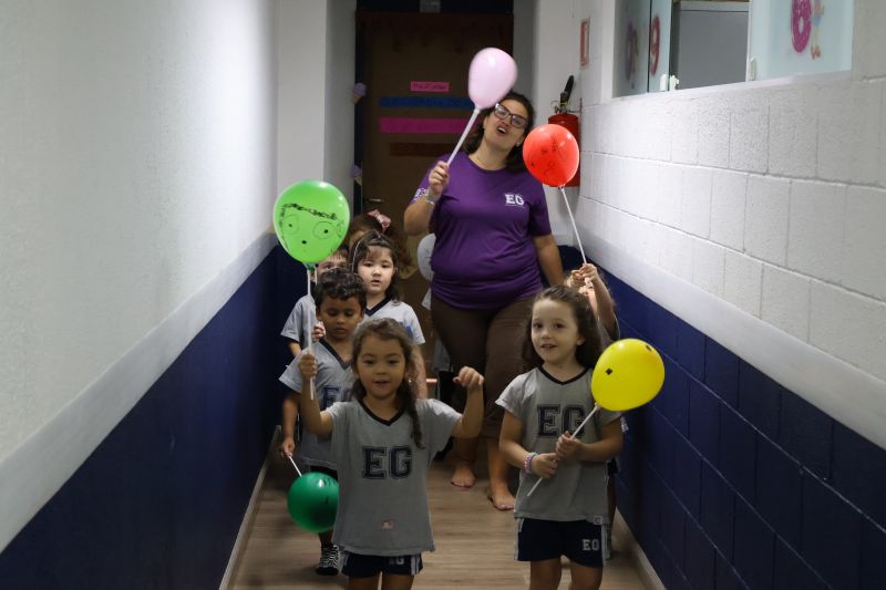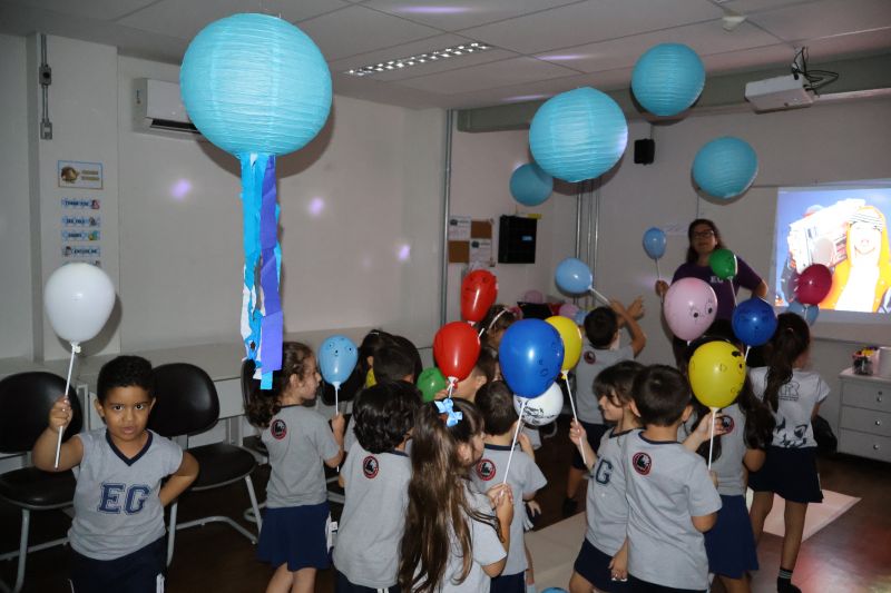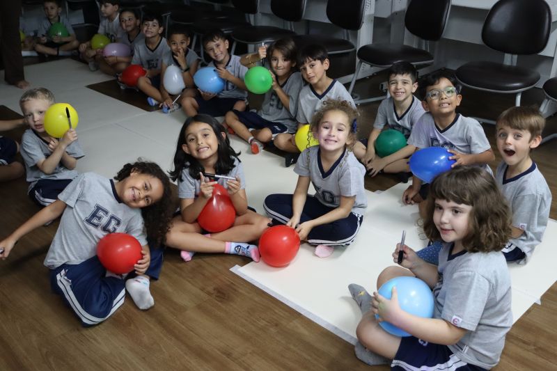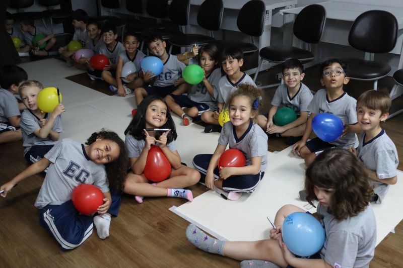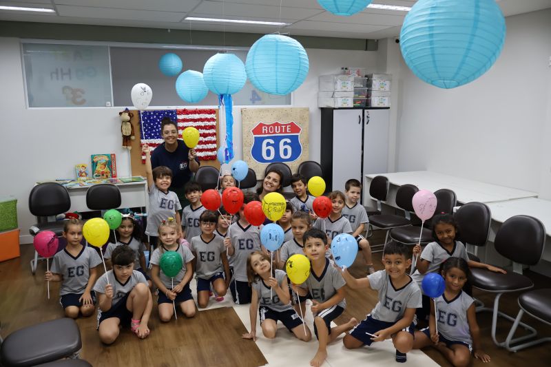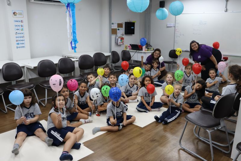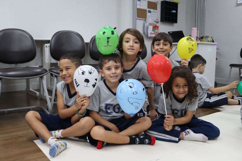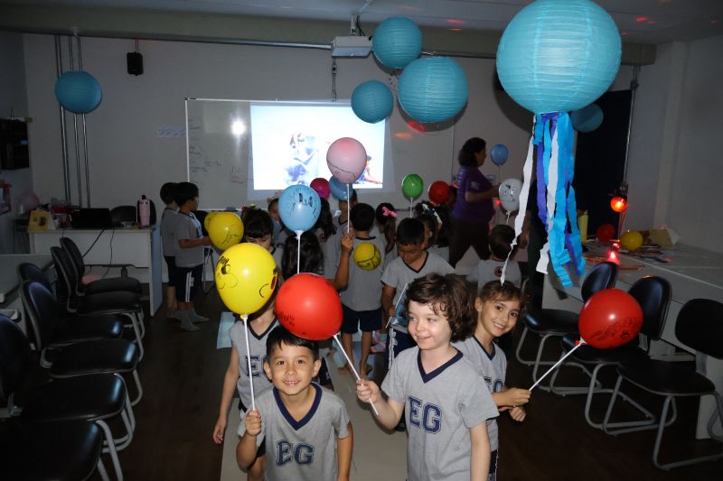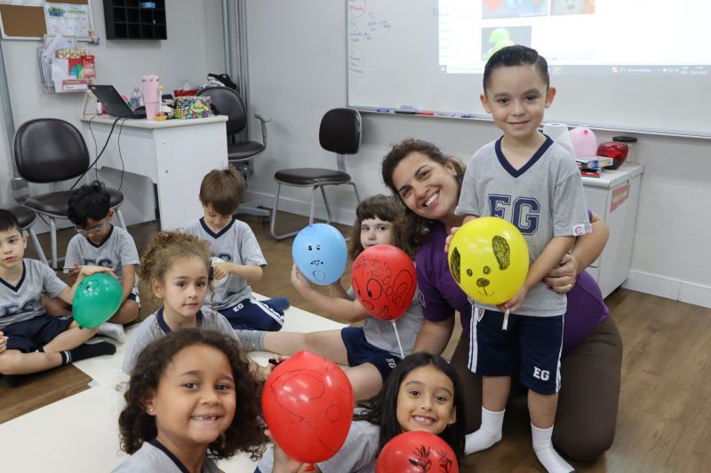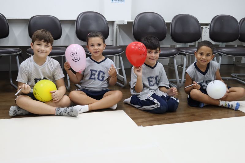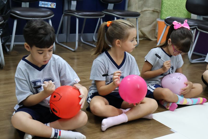 Os estudantes praticaram a linguagem oral, em inglês, com músicas e vivências coletivas. Para finalizar essa dinâmica, com o objetivo de intensificar os conhecimentos previamente obtidos em aula, a professora organizou um desfile, o Balloon Parade, no qual as crianças soltaram a criatividade, decorando seus balões e se divertindo por meio da dança.