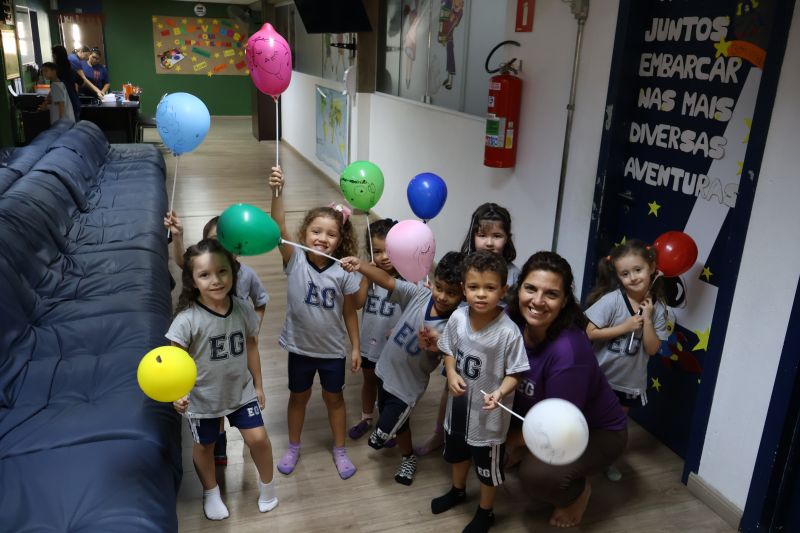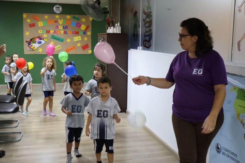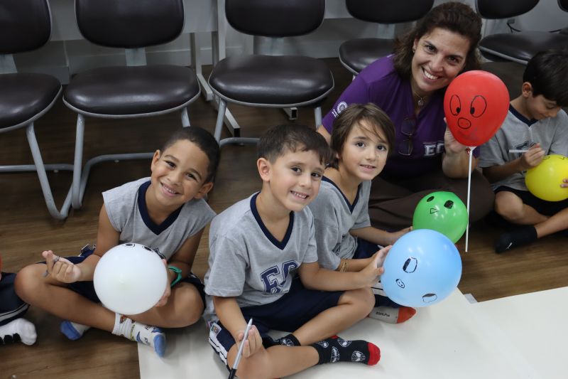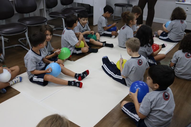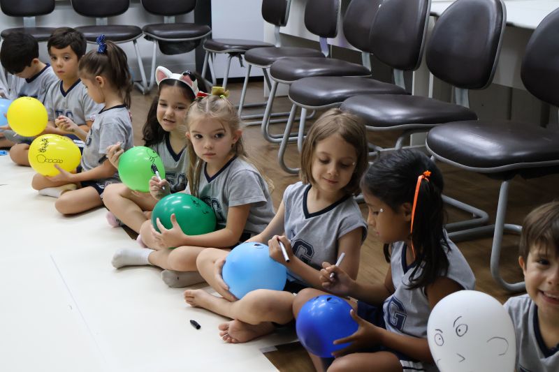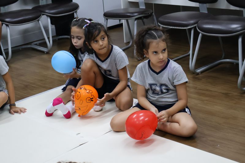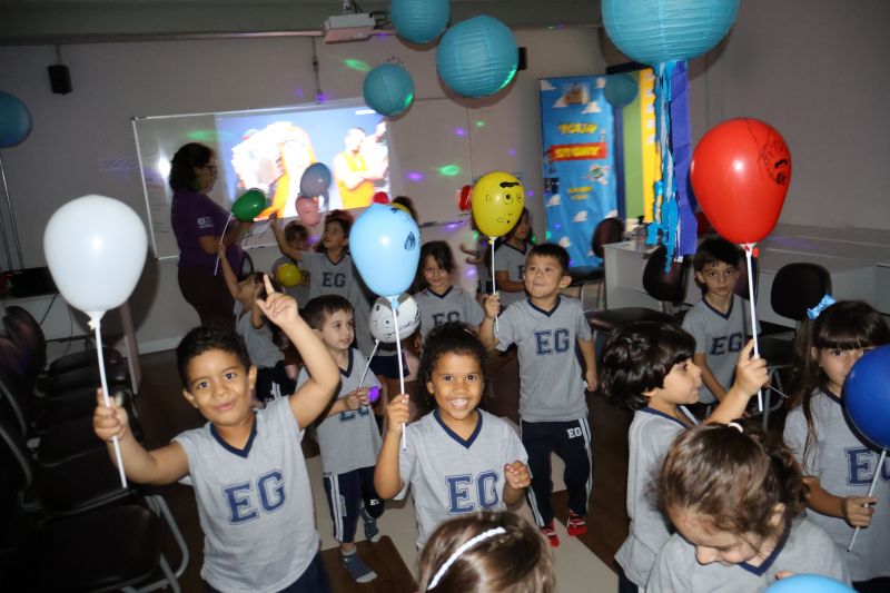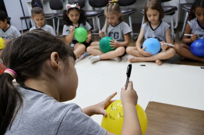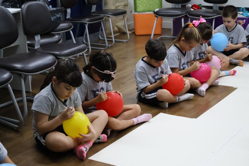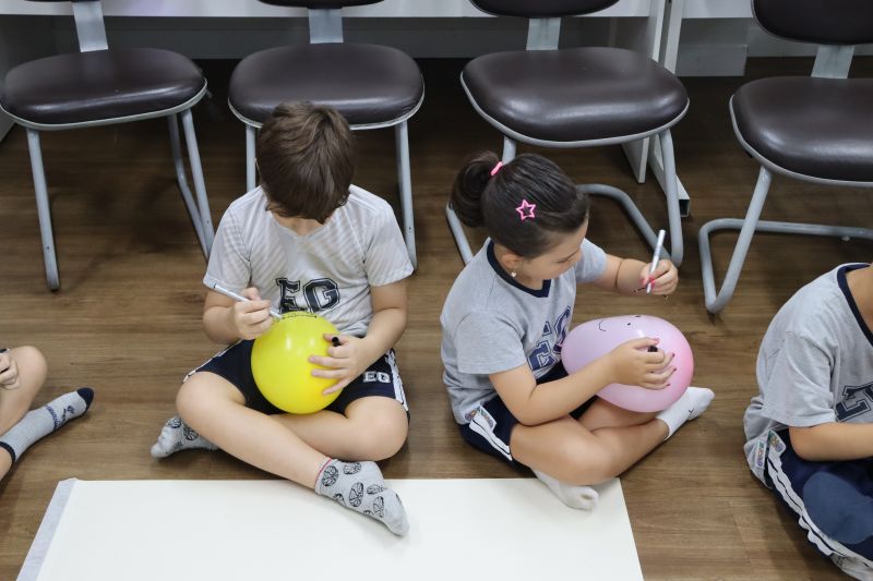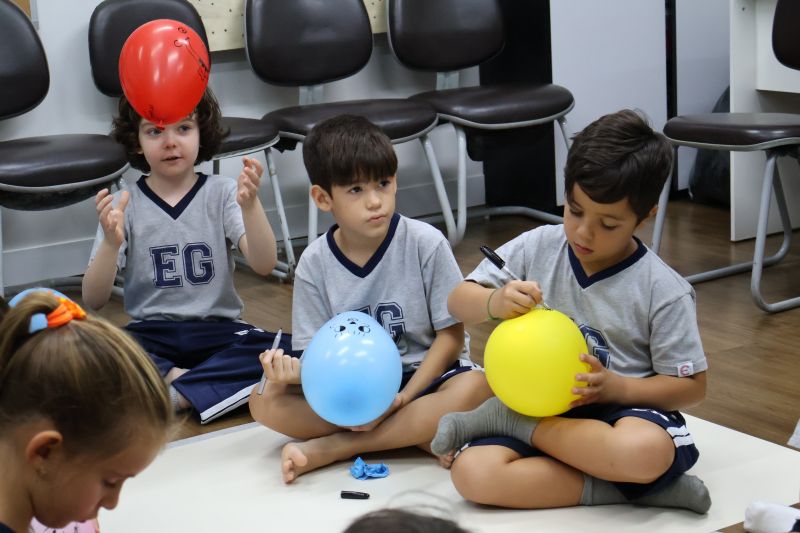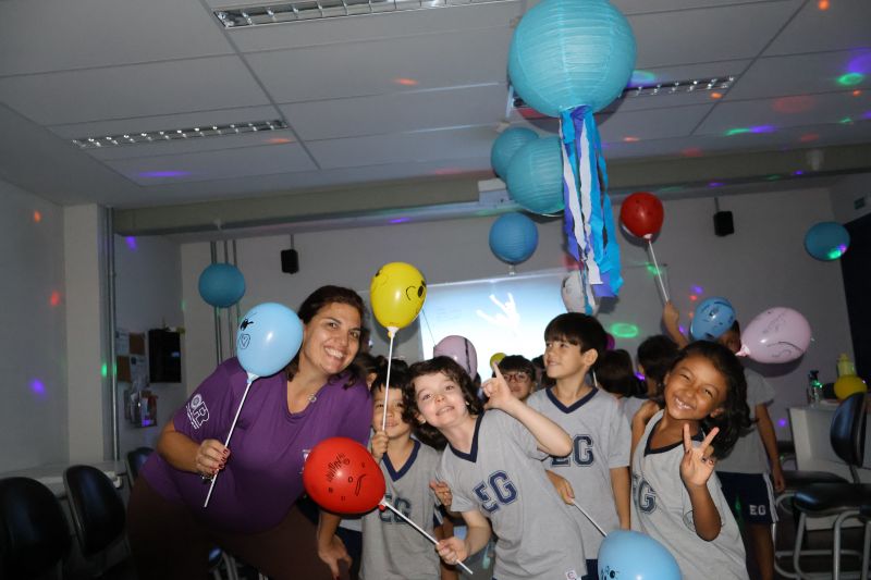 Os estudantes praticaram a linguagem oral, em inglês, com músicas e vivências coletivas. Para finalizar essa dinâmica, com o objetivo de intensificar os conhecimentos previamente obtidos em aula, a professora organizou um desfile, o Balloon Parade, no qual as crianças soltaram a criatividade, decorando seus balões e se divertindo por meio da dança.
