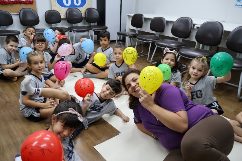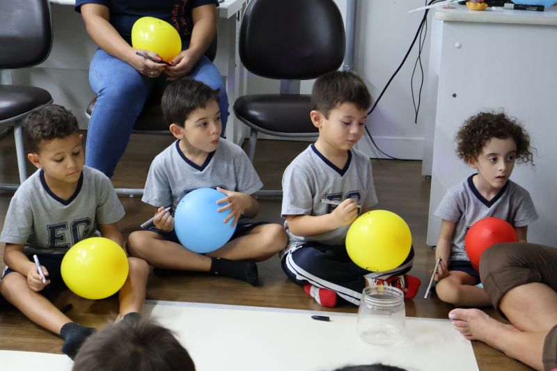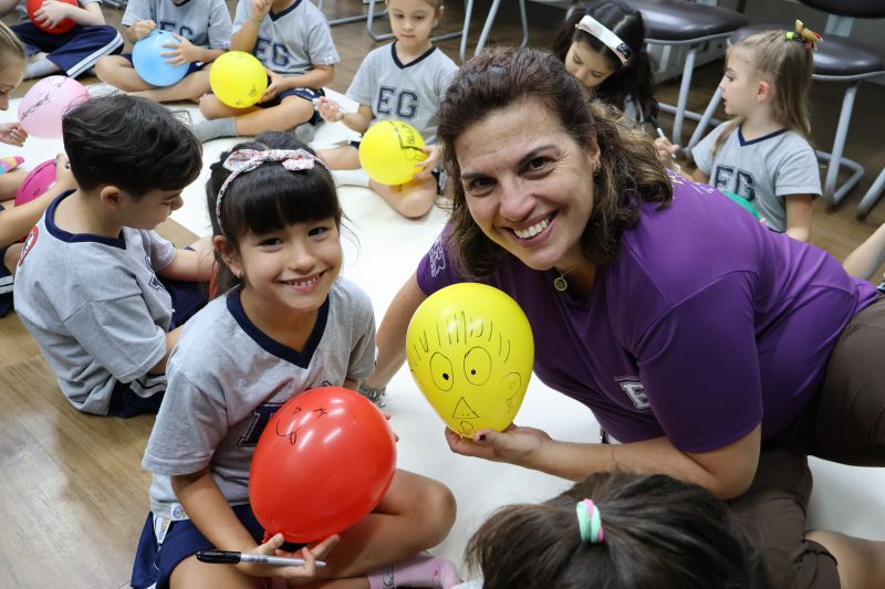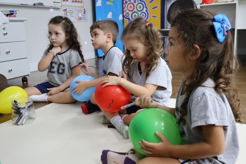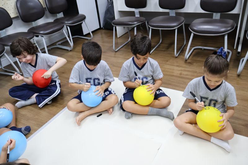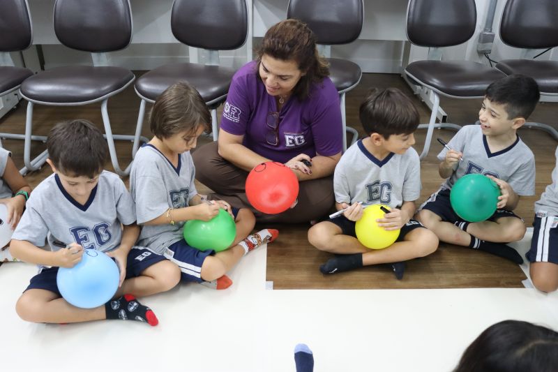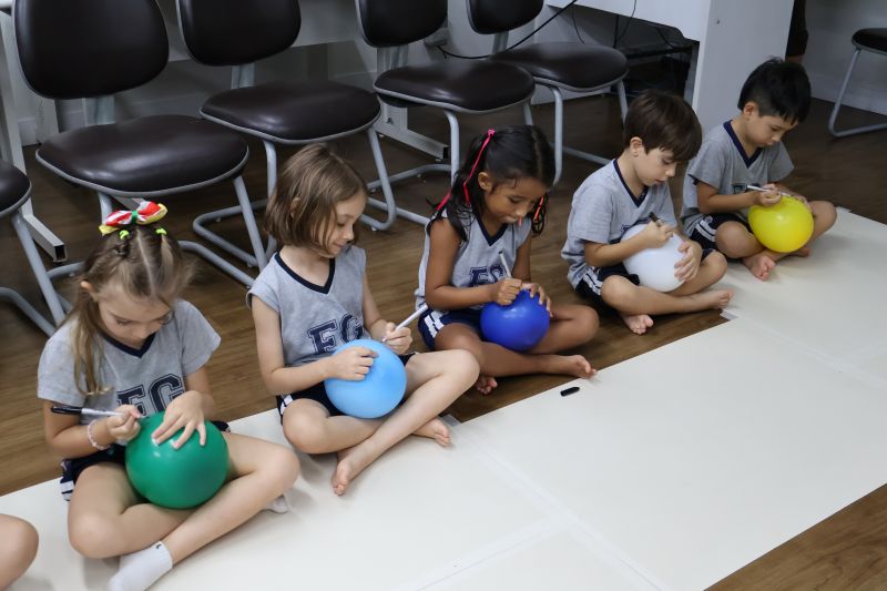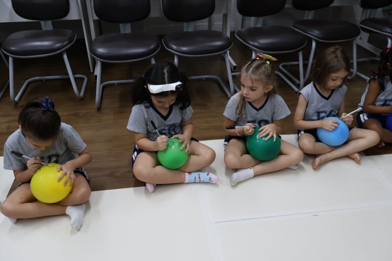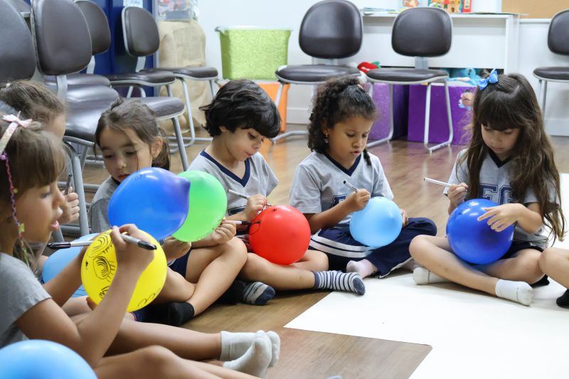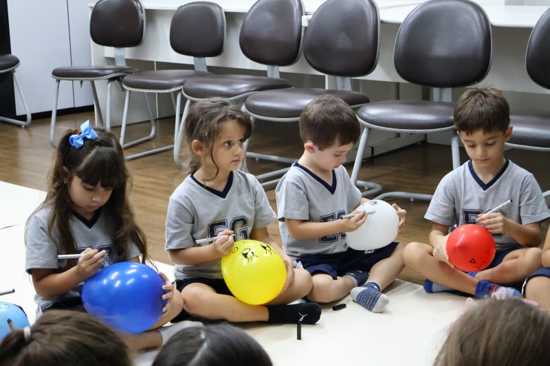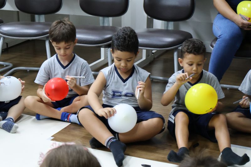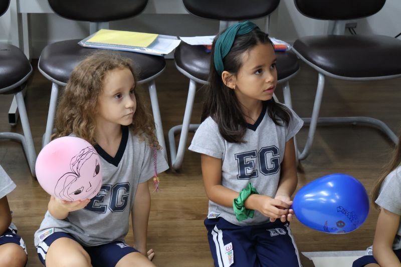 Os estudantes praticaram a linguagem oral, em inglês, com músicas e vivências coletivas. Para finalizar essa dinâmica, com o objetivo de intensificar os conhecimentos previamente obtidos em aula, a professora organizou um desfile, o Balloon Parade, no qual as crianças soltaram a criatividade, decorando seus balões e se divertindo por meio da dança.