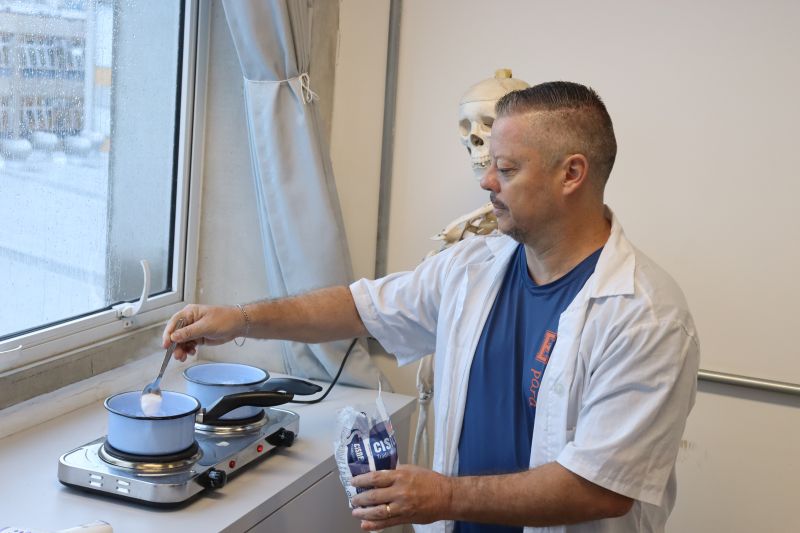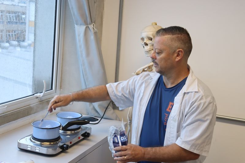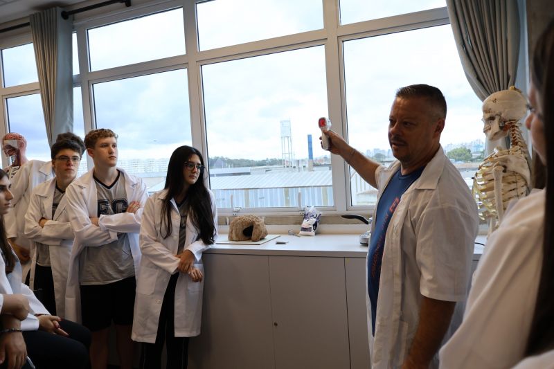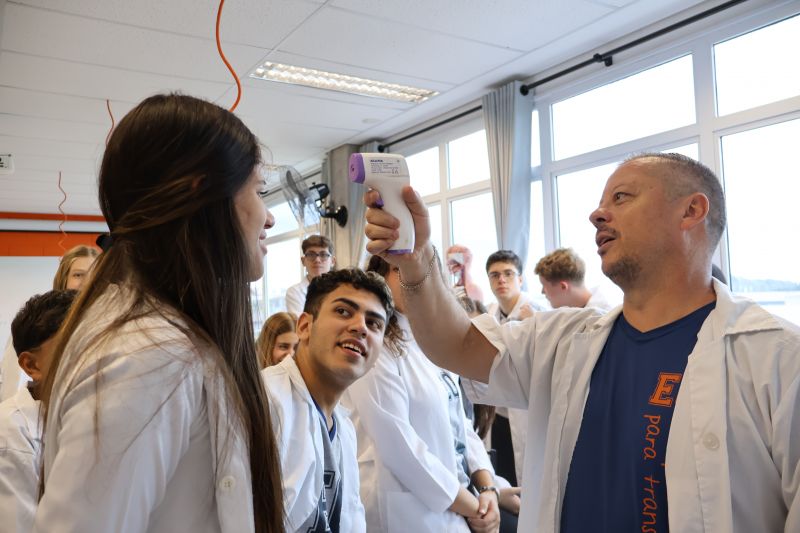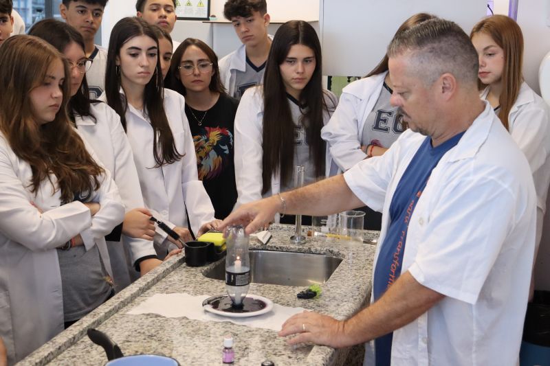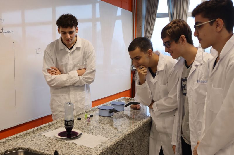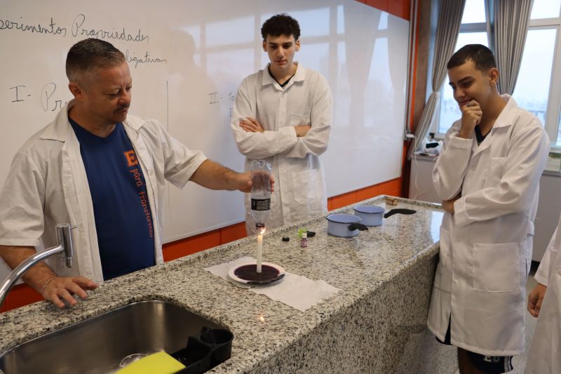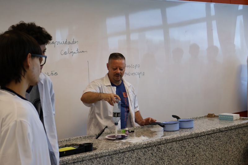 Os alunos da 2ª série do Ensino Médio participaram de uma experiência no laboratório, com o Professor Alex, sobre propriedades coligativas.