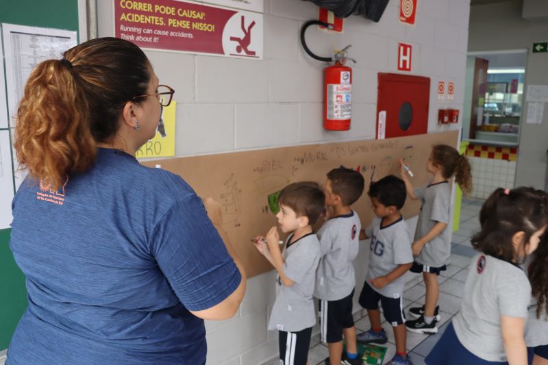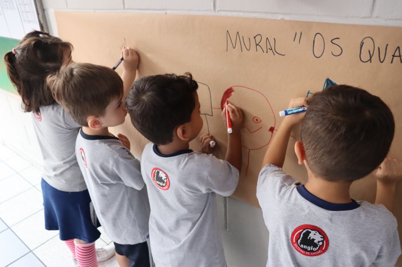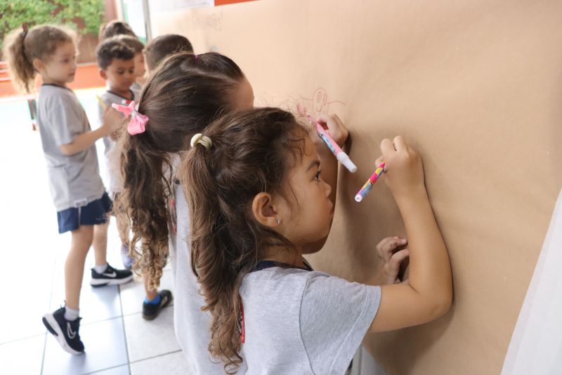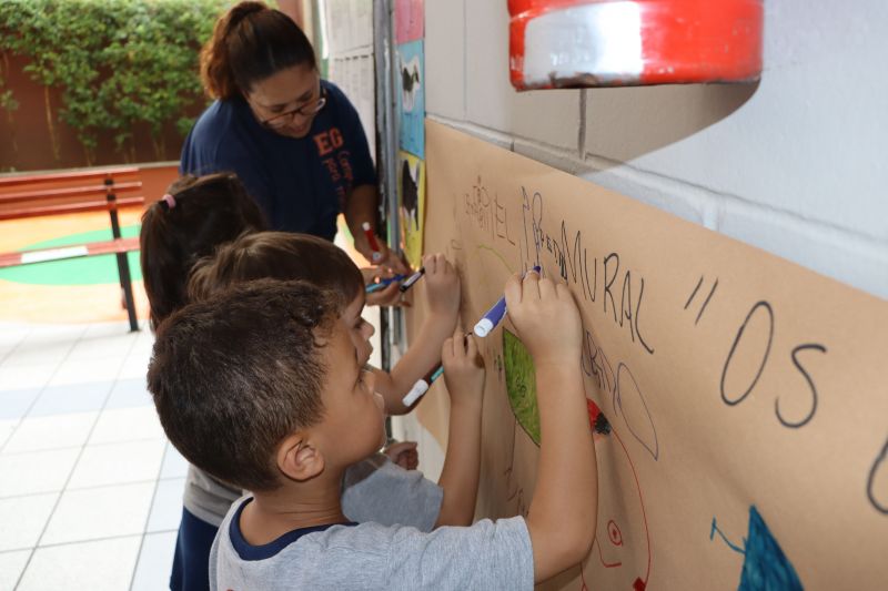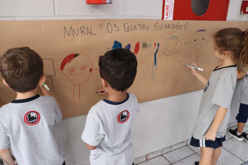 Após a leitura, a turma colocou a criatividade em prática, ao confeccionar um grande cartaz ilustrado com os personagens da história, escrevendo também seus nomes.