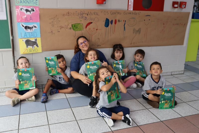 Os pequenos do Nível I, orientados pela Professora Luciana, vivenciaram um momento de leitura do livro infantil Os Quatro Guardiões, da Editora Hora da História.