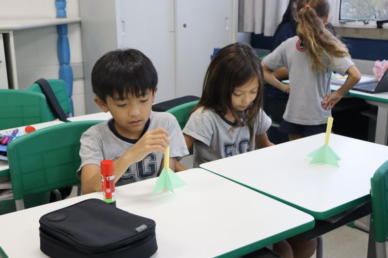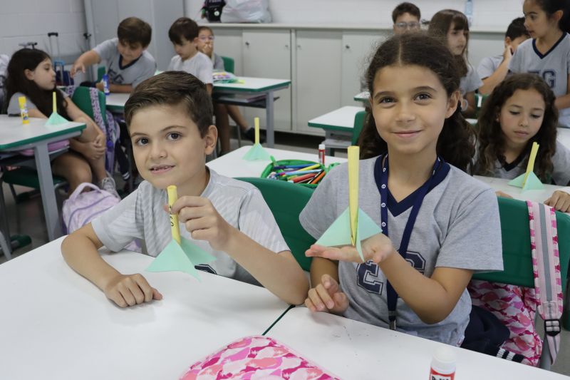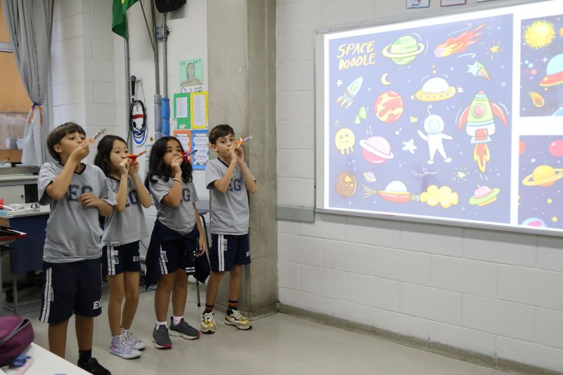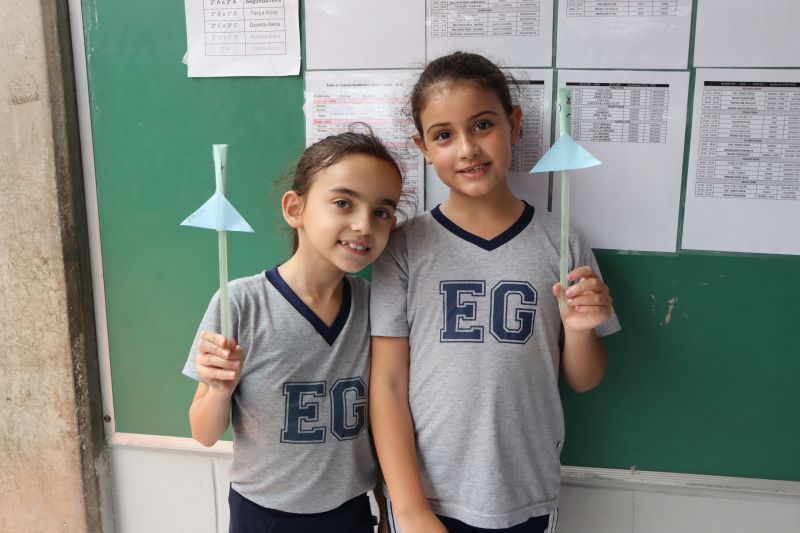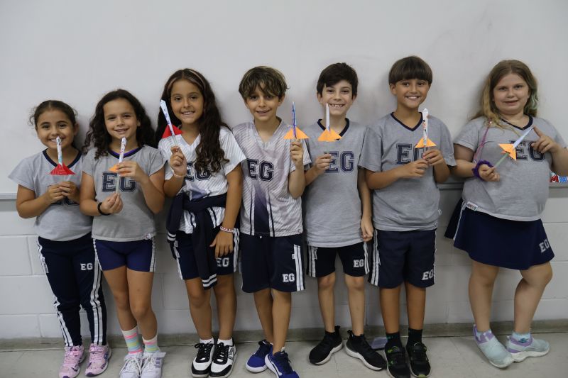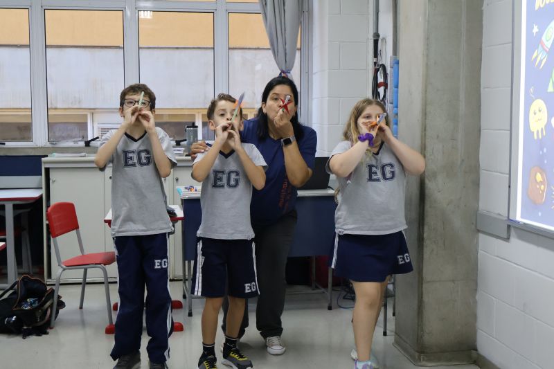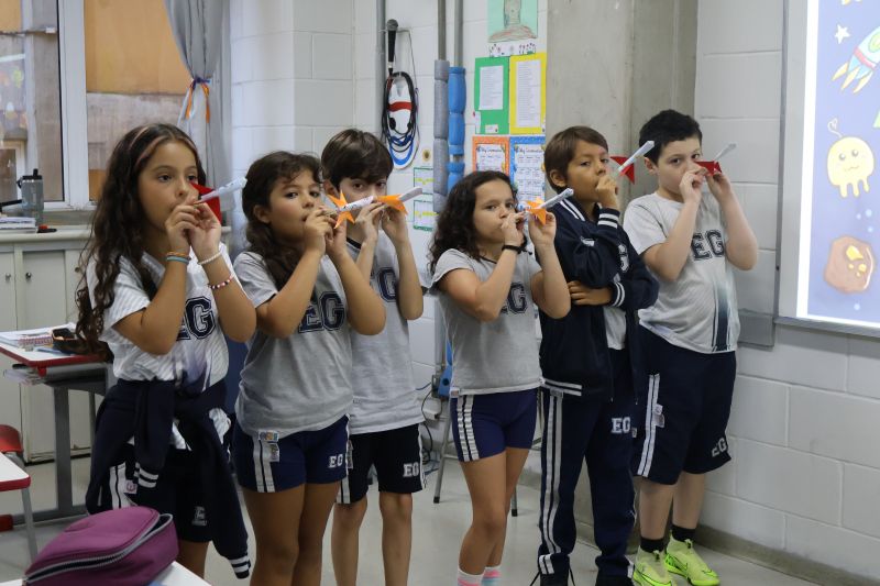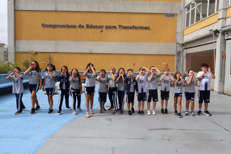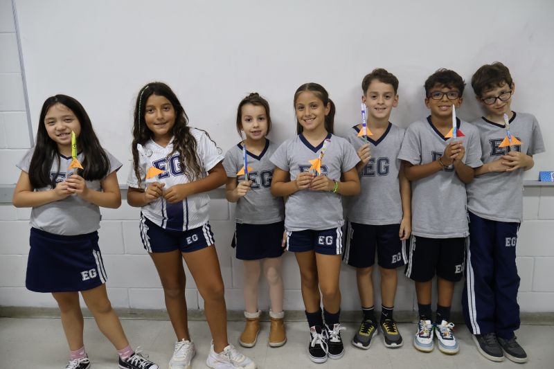 Os alunos do 3º ano do Ensino Fundamental, orientados pelas Professoras Tatiana, Letícia, Gina e Paula, construíram um foguete de papel e fita adesiva.