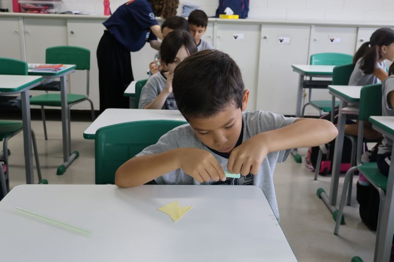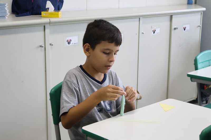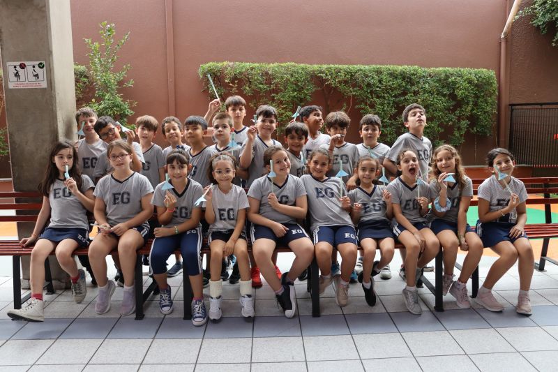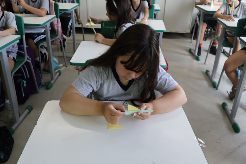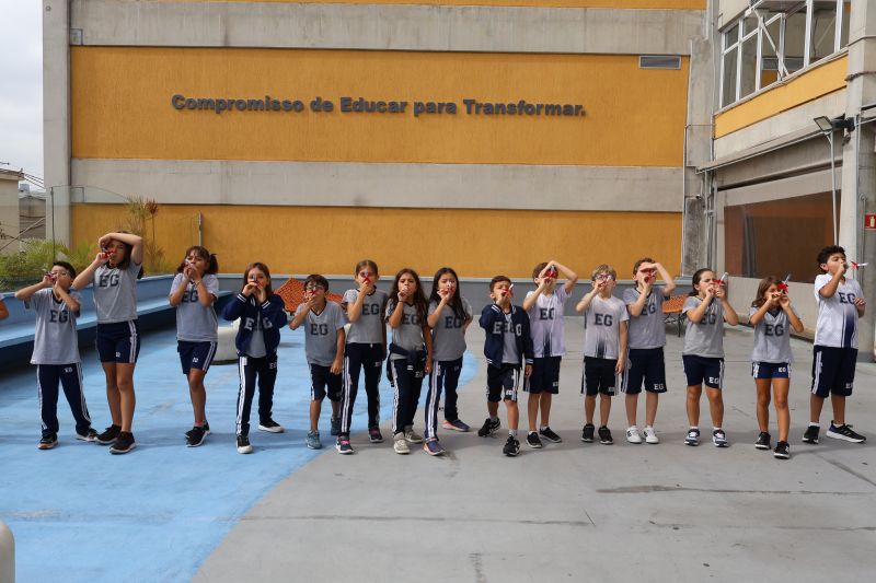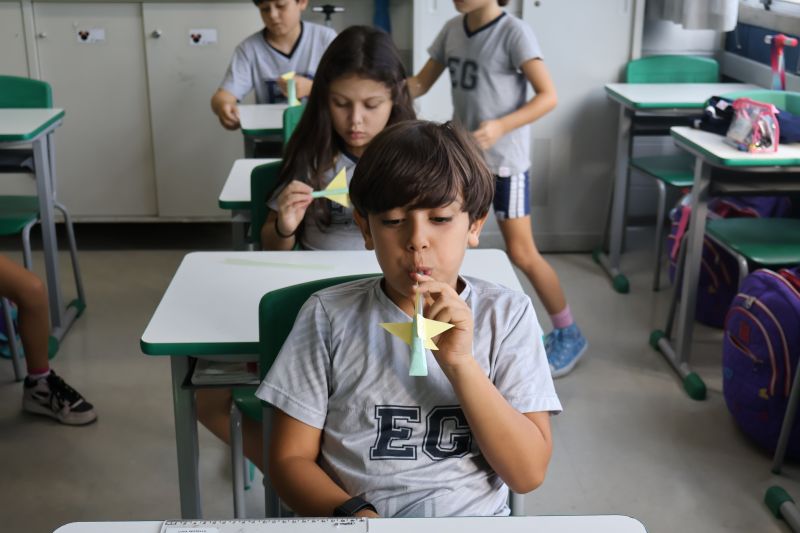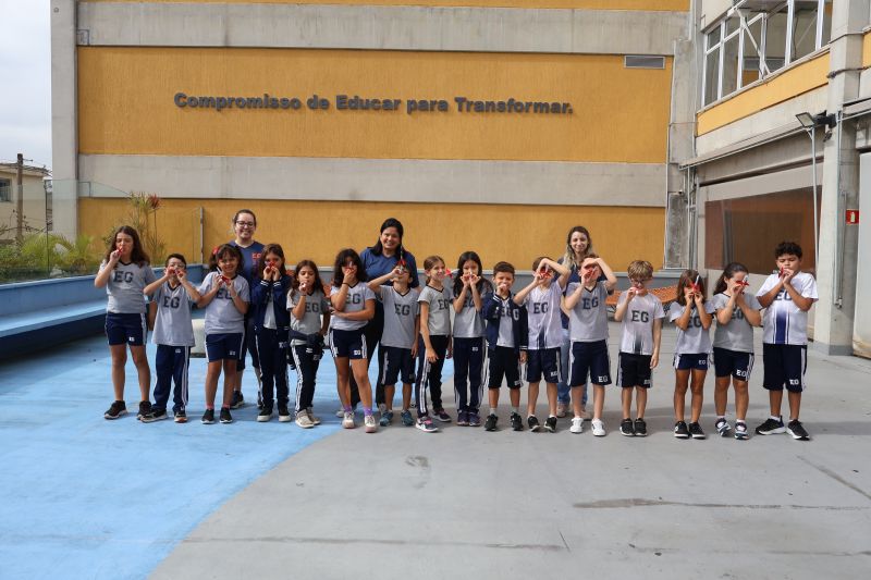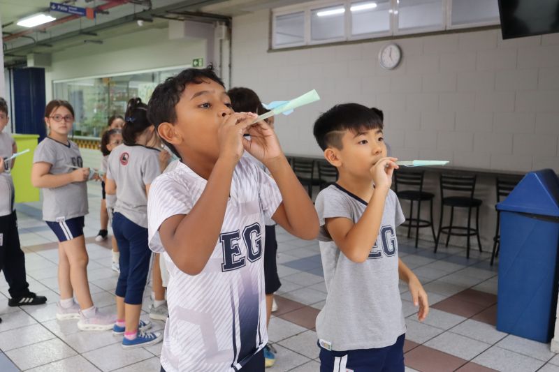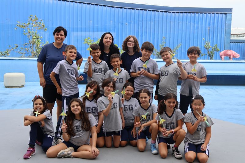 Os alunos do 3º ano do Ensino Fundamental, orientados pelas Professoras Tatiana, Letícia, Gina e Paula, construíram um foguete de papel e fita adesiva.