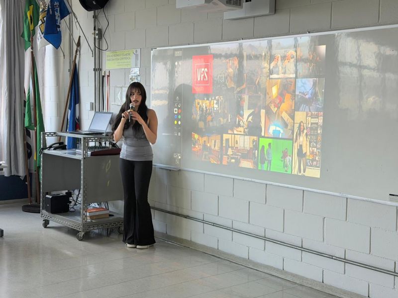 Como parte dessa iniciativa, o EG recebeu a ex-aluna, e atualmente cineasta, produtora audiovisual e calígrafa, Sofia Cameron, para uma palestra especial. Durante o encontro, ela compartilhou com os estudantes sua trajetória profissional e explicou como funciona o trabalho no universo do cinema e da produção audiovisual.