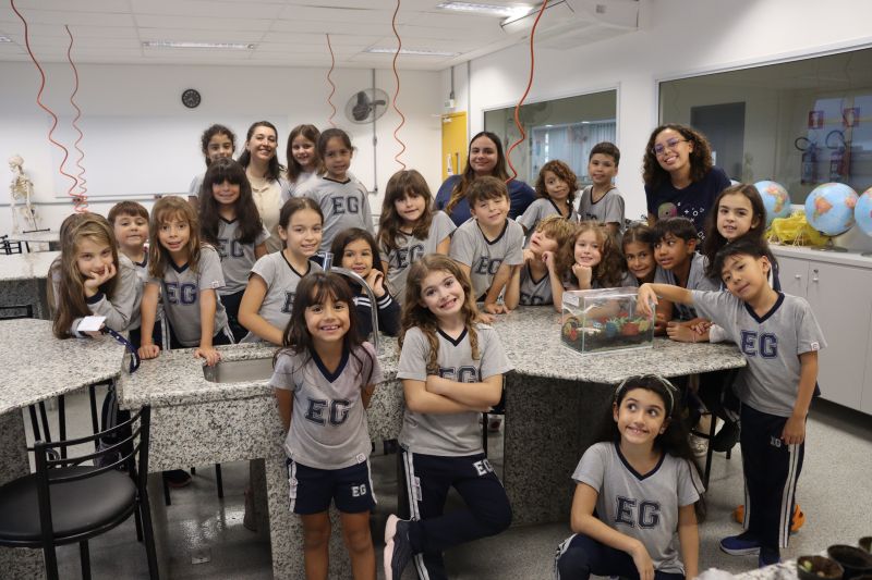 O objetivo da atividade foi compreender o conceito de terrário como um ambiente que imita o ecossistema natural, colocando em prática tudo o que aprenderam em sala de aula.