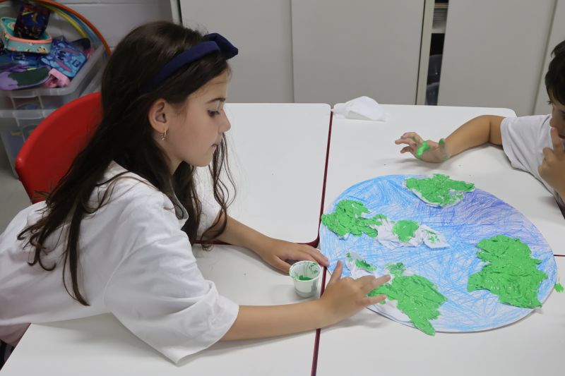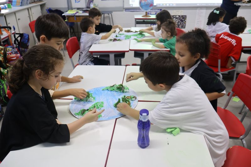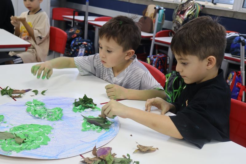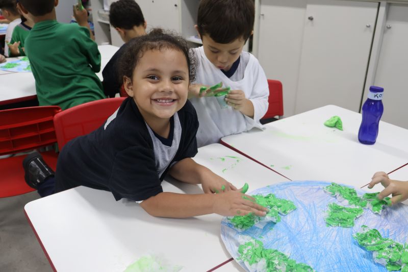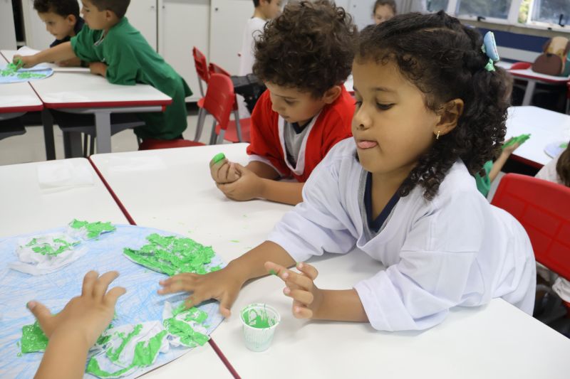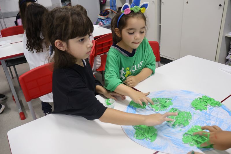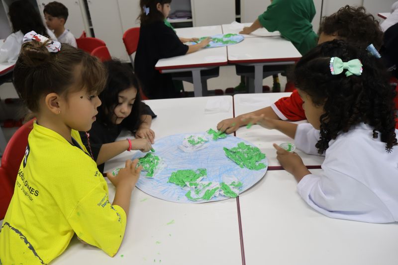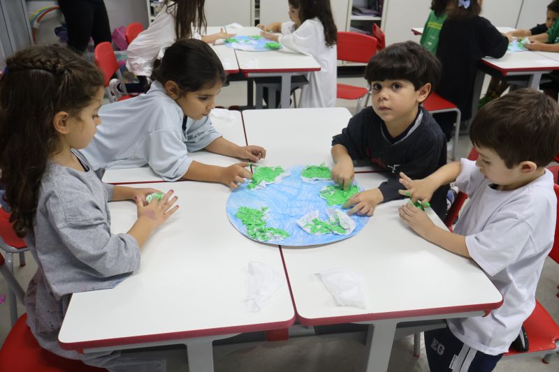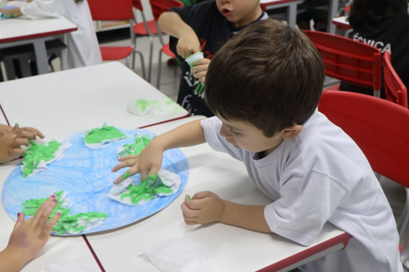 Em grupos, os pequenos confeccionaram o planeta Terra com diversos materiais, como tintas, folhas e papéis para simbolizar a terra, as árvores e a água.