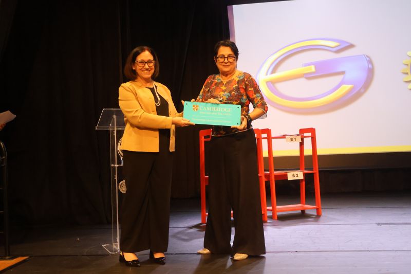 A cerimônia foi ainda mais especial com o anúncio de que o Colégio agora é oficialmente uma Cambridge International School, passando a adotar o currículo internacional em atividades extracurriculares. Durante a cerimônia, a Diretora-Geral, Professora Janice Aparecida Guizelini, recebeu a placa de Cambridge International School entregue pela Sra. Fátima Trindade, Diretora do São Paulo Open Centre, oficializando essa importante conquista do Colégio. Além disso, a instituição foi contemplada com o prêmio We grow with Cambridge, entregue pela Sra. Shiela Evans, reforçando o compromisso com a excelência no ensino de inglês.